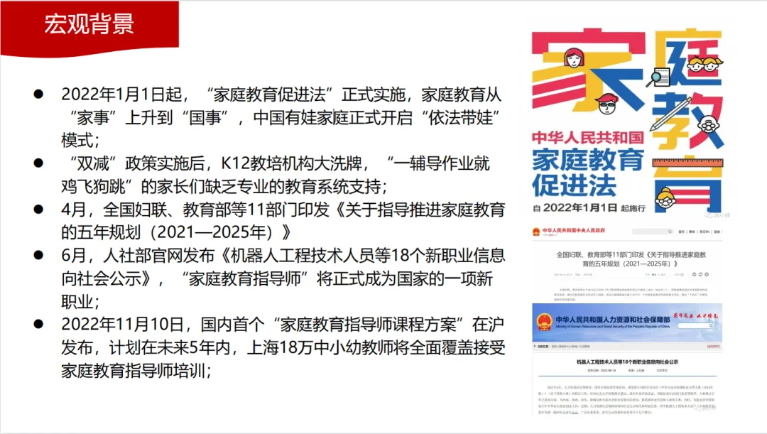 政策全面加持:“十四五” 规划明确提出加强家庭、家教、家风建设,多地将家庭教育指导服务纳入民生实事,要求中小学、幼儿园、社区必须配备专业指导人员