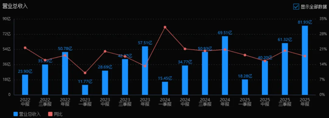 2025年营业总收入为 81.93亿元,相较于2024年的69.51亿元,增长了17.87%。评价: 公司保持了两位数的稳健增长,虽然略低于2024年的20.86%增速,但仍处于健康扩张区间,显示出较强的市场拓展能力。