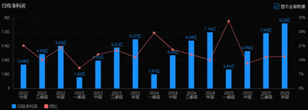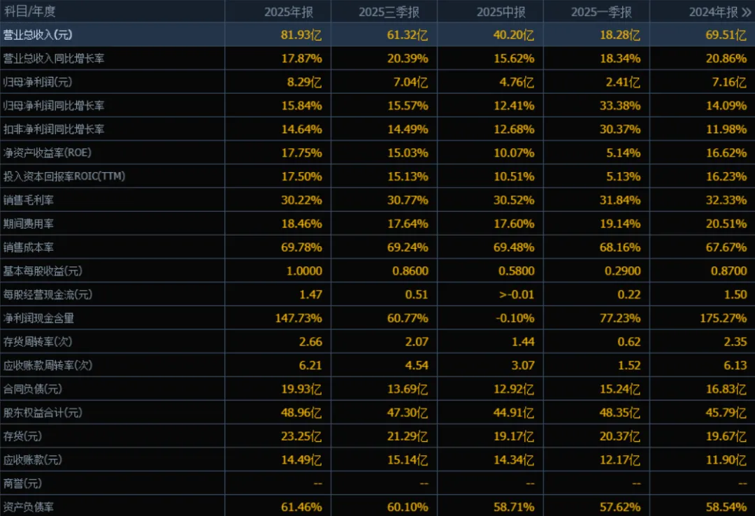 2025年归母净利润为 8.29亿元,相较于2024年的7.16亿元,增长了15.84%。评价: 利润增速略低于营收增速(17.87%),可能与毛利率微降或费用结构调整有关,但整体盈利增长稳健,且高于2024年的14.09%,盈利能力有所增强。