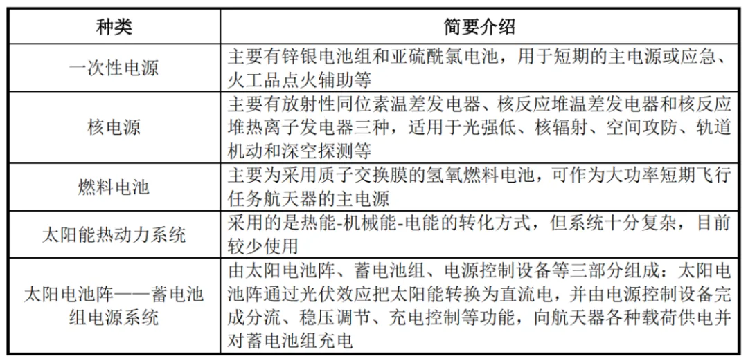 宇航电源系统是支撑航天器长期在轨运行的核心基础设施,涵盖发电、储能、控制、传输及系统集成等全套解决方案,应用场景已实现从深海至深空的广泛覆盖。由于太空环境极端(温差大、强辐射、高真空),宇航电源产品分为五大类,适配不同任务需求:一次性电源(锌银电池、亚硫酰氯电池,用于短期供电/应急)、核电源(放射性同位素温差发电器等,适配深空探测)、燃料电池(氢氧质子交换膜型,用于大功率短期任务)、太阳能热动力系统(转化复杂,应用较少)、太阳电池阵—蓄电池组电源系统(核心组成+光伏效应供电,应用最广泛)。
