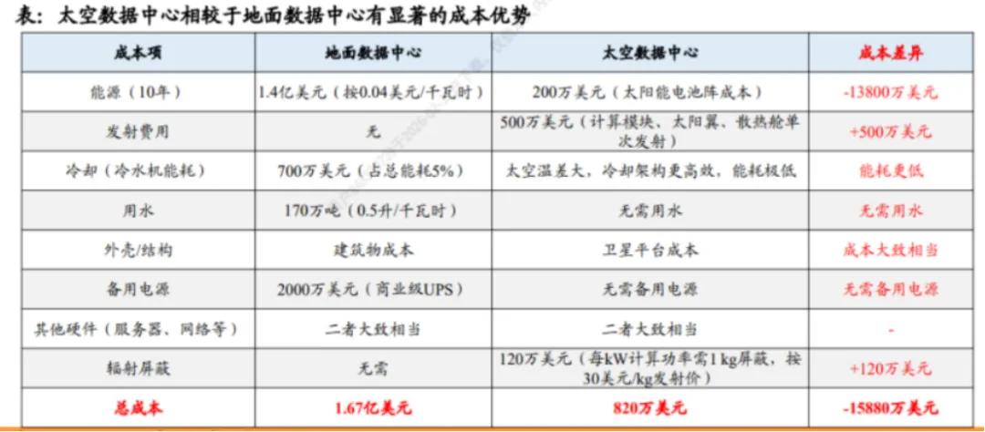反观太空数据中心方案(参考东吴证券研报分析),其能源供给系统仅需在制造期一次性投入约200万美元部署超大型太阳能电池阵列,后续发电的边际成本趋近于零;散热则完全依赖真空中极度低温的自然热辐射,水耗与散热电耗双双归零。尽管在建设初期需要承担约500万美元的高昂发射费用(基于特定降本预期)以及制造辐射屏蔽模块与卫星平台的巨额开销,但从十年全生命周期的总账本来看,太空算力中心的总运营成本仅约820万美元,甚至不到地面同等规模数据中心总成本的十分之一,更不必说在持续压低的发射成本和技术的更新迭代。这种由规模化和环境红利带来的经济性优势,赋予了太空算力极强的商业潜力。