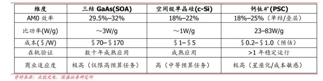 1. 技术路线对比:① 三结砷化镓(GaAs):AMO效率29.5%-32%,比功率~3W/g,抗辐照性强,适用于高端航天任务,成本70-170美元/W,乾照光电出货量国内第一,已批量供应低轨卫星;② 特种晶硅:效率18%-22%,比功率~1W/g,成本1-5美元/W,依托地面光伏技术,适用于中等预算任务;③ 钙钛矿:单结/叠层效率18%-25%,比功率23-83W/g,成本预估0.2-1.0美元/W,制备灵活,是未来方向,上海港湾、东方日升等企业已实现在轨验证或技术突破。