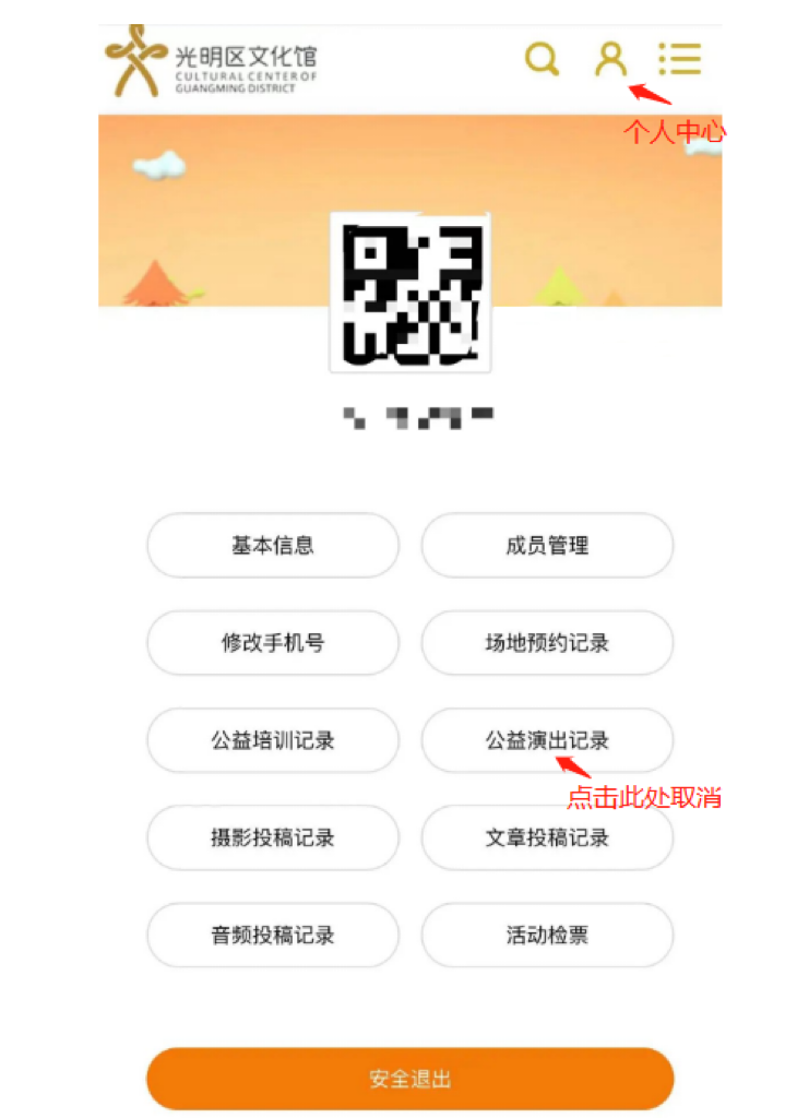 6、因故无法参加活动请提前1天申请取消报名。( 取消方式:登录光明区文化馆官网→用户中心→公益演出记录→点击“取消”)