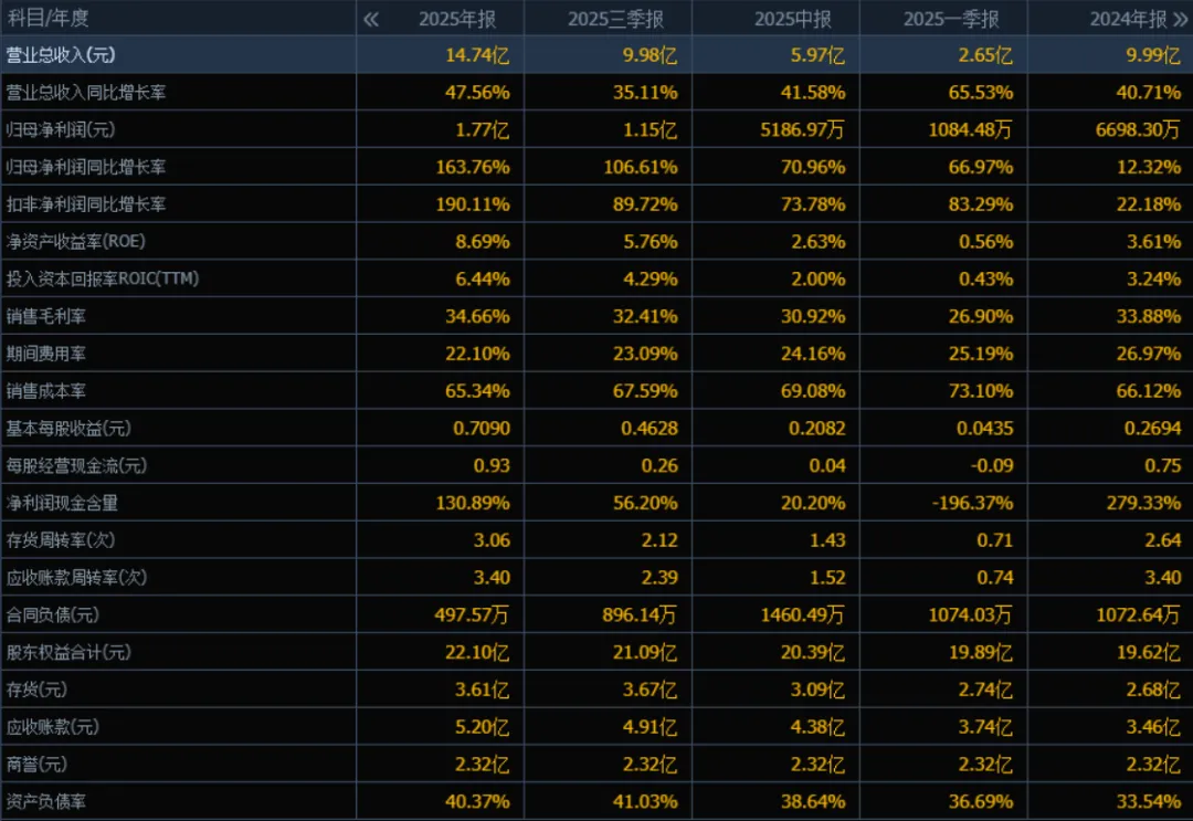 2025年归母净利润为1.77亿元,相较于2024年的6698.30万元增长了163.76%。评价: 利润增速远超收入增速,表明公司盈利能力大幅提升,可能得益于规模效应、成本控制或产品结构优化。