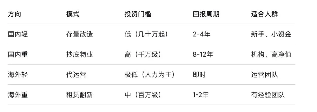 今天这篇文章,我把当下最值得关注的四种酒店投资模型一次性讲清楚——两种在国内,两种在海外。