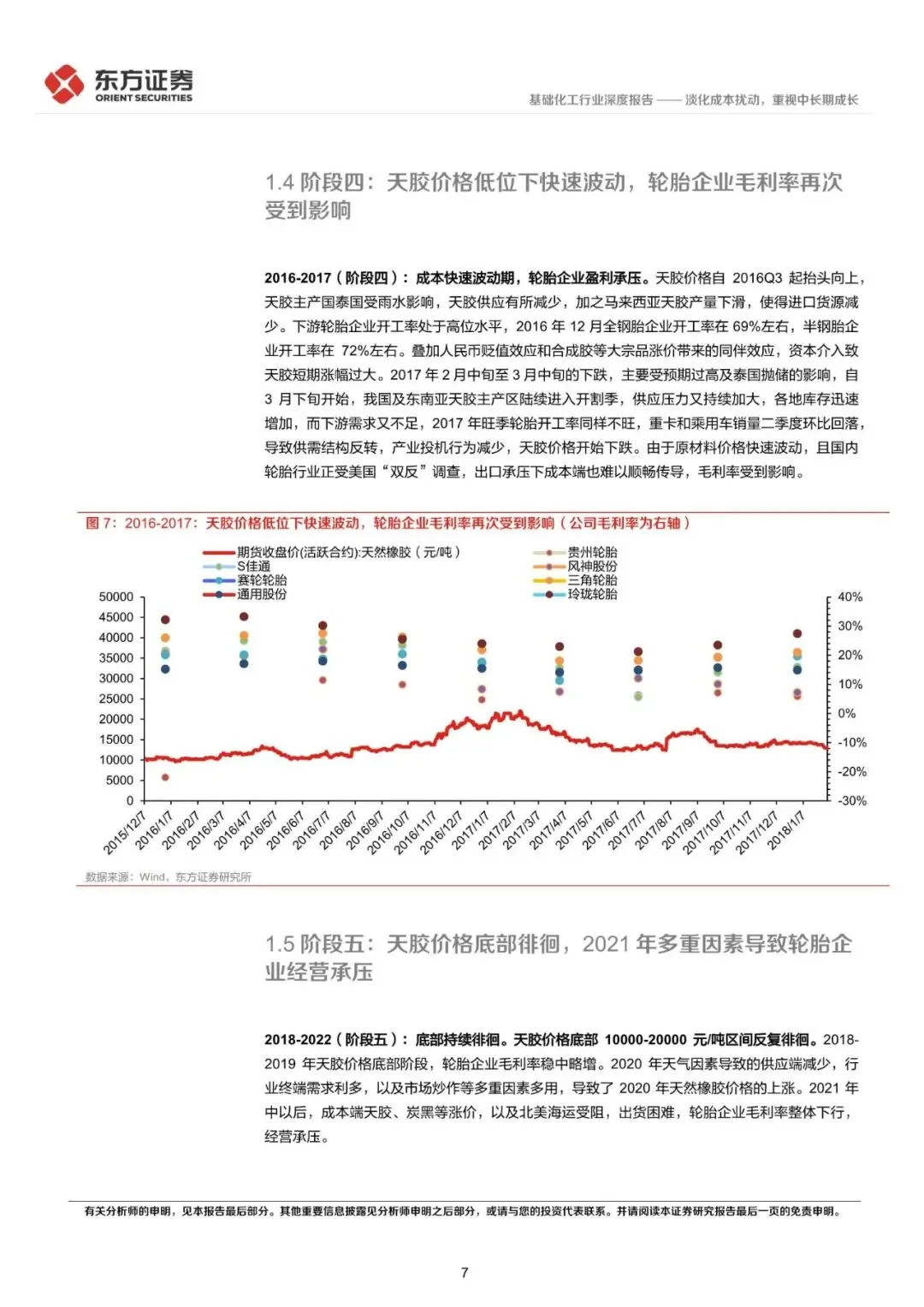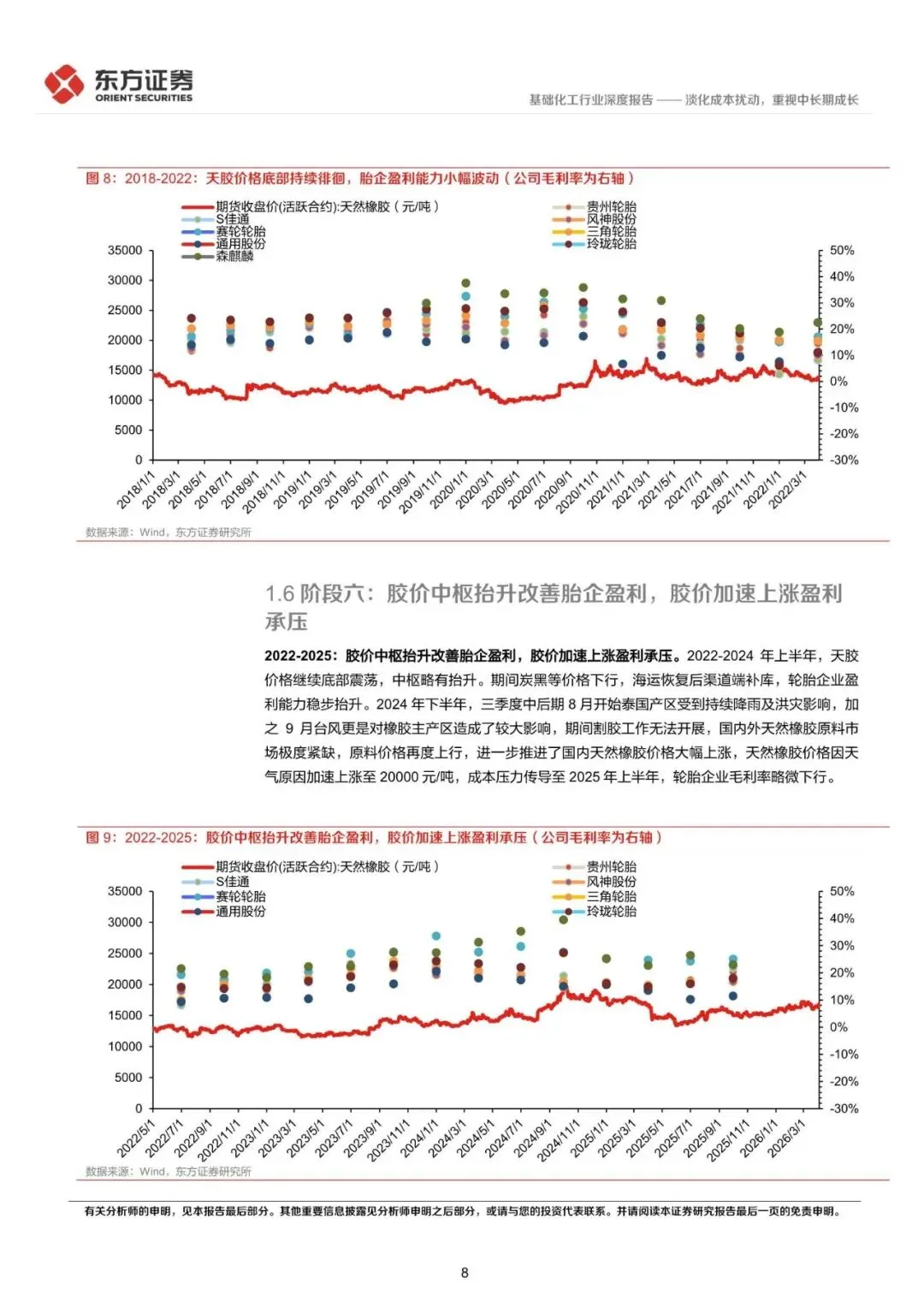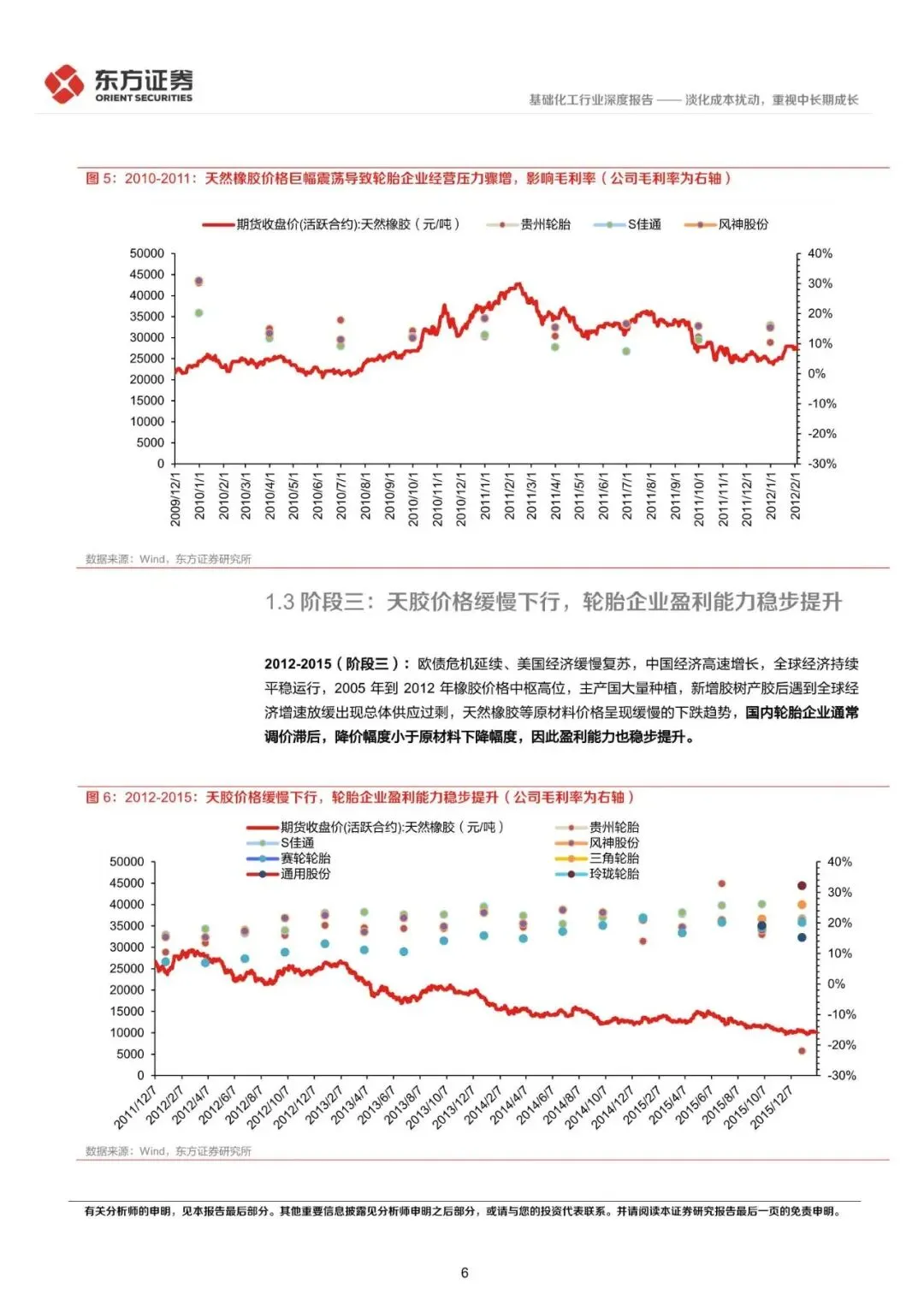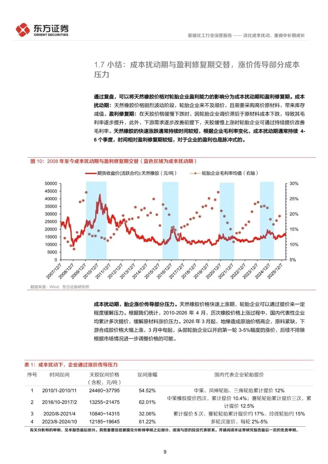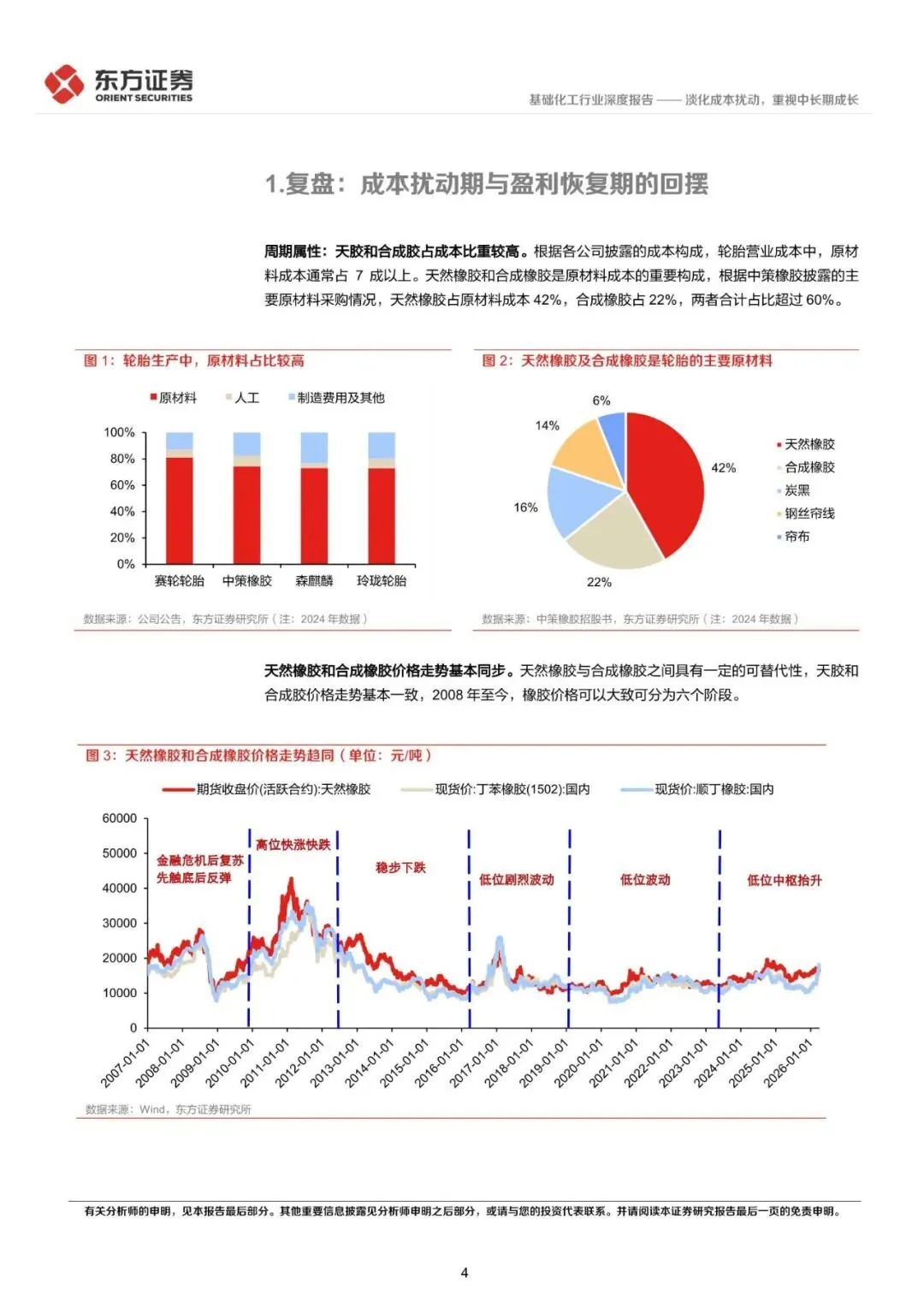 轮胎行业经历成本扰动期与盈利恢复期的回摆。轮胎行业营业成本中,原材料成本通常占 7 成左右,而天然橡胶和合成橡胶占原材料比例 60%以上,原材料波动影响轮胎企业盈利。根据我们复盘,可以将天然橡胶价格对轮胎企业盈利能力的影响分为成本扰动期和盈利修复期。成本扰动期:橡胶价格剧烈波动阶段,行业难以及时顺价,轮胎企业利润被挤压,且原材料价格高位造成减值。