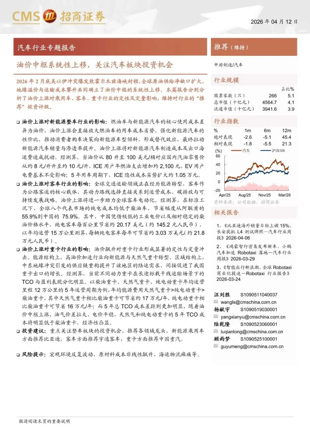 回复暗号:汽车行业专题报告:油价中枢系统性上移,关注汽车板块投资机会-260412-招商证券-23页