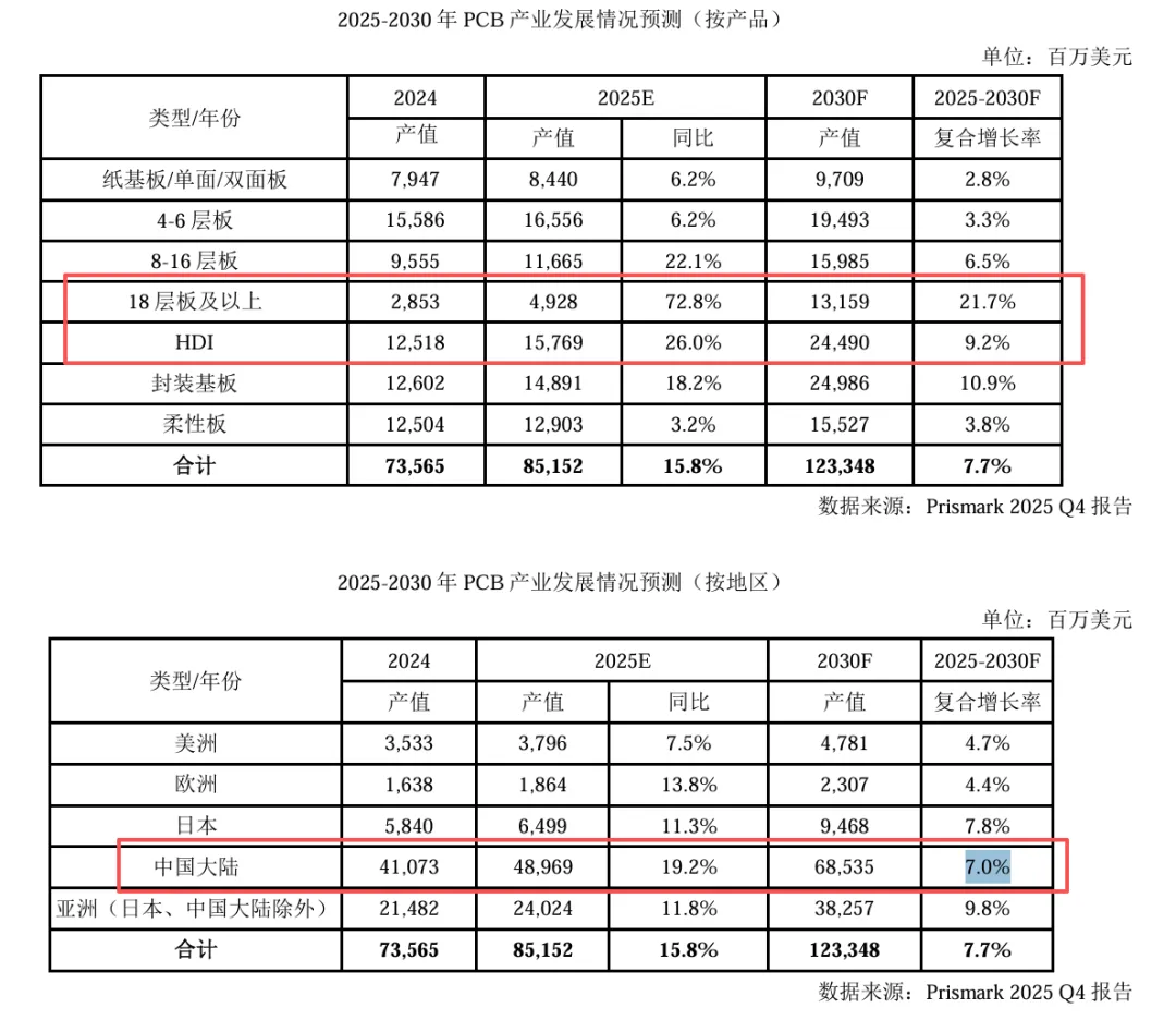 中国这边2025年到2030年,年复合增长率是7%-8.7%。整个PCB行业年复合增长率就是7%到9%之间。和大家想的动辄每年增长20%,差距还是很大的。所以,PCB这个行业目前非常好,但是没有大家想的这么好。在未来的五年,年复合增长率也就是7%到9%之间,并没有非常夸张。