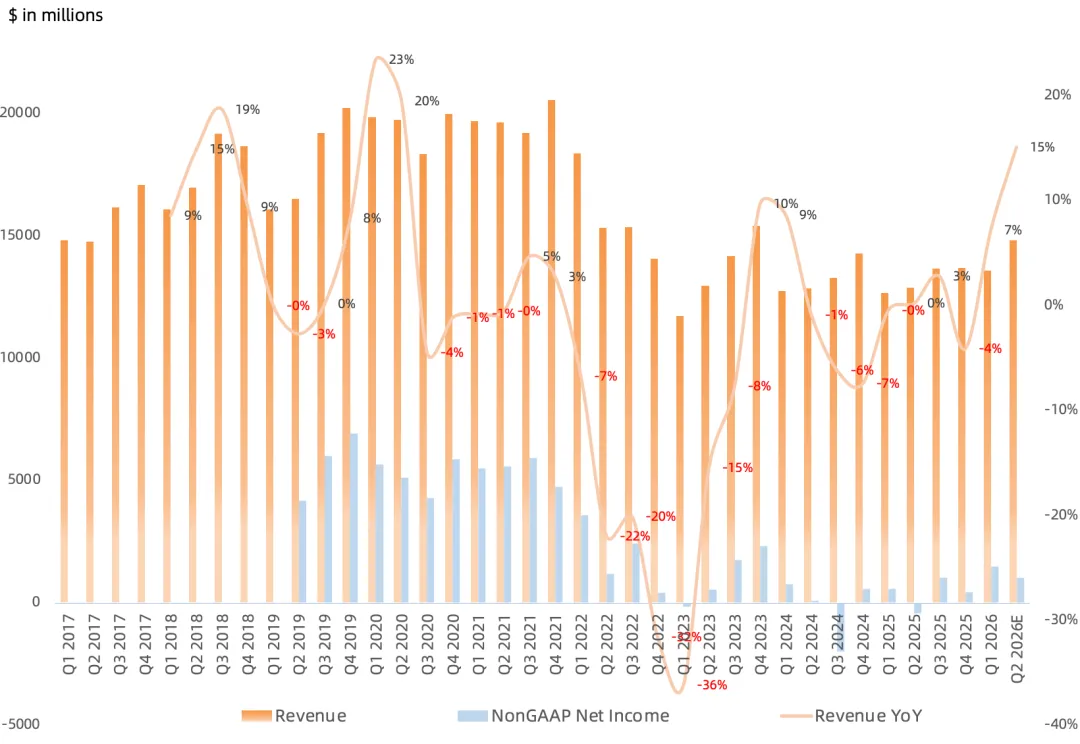 营收135.8亿美元,同比增长7%,环比下滑1%,高于此前指引区间117-127亿美元;预计下季度营收区间中值143亿美元,同比增长11%,环比增长5%;