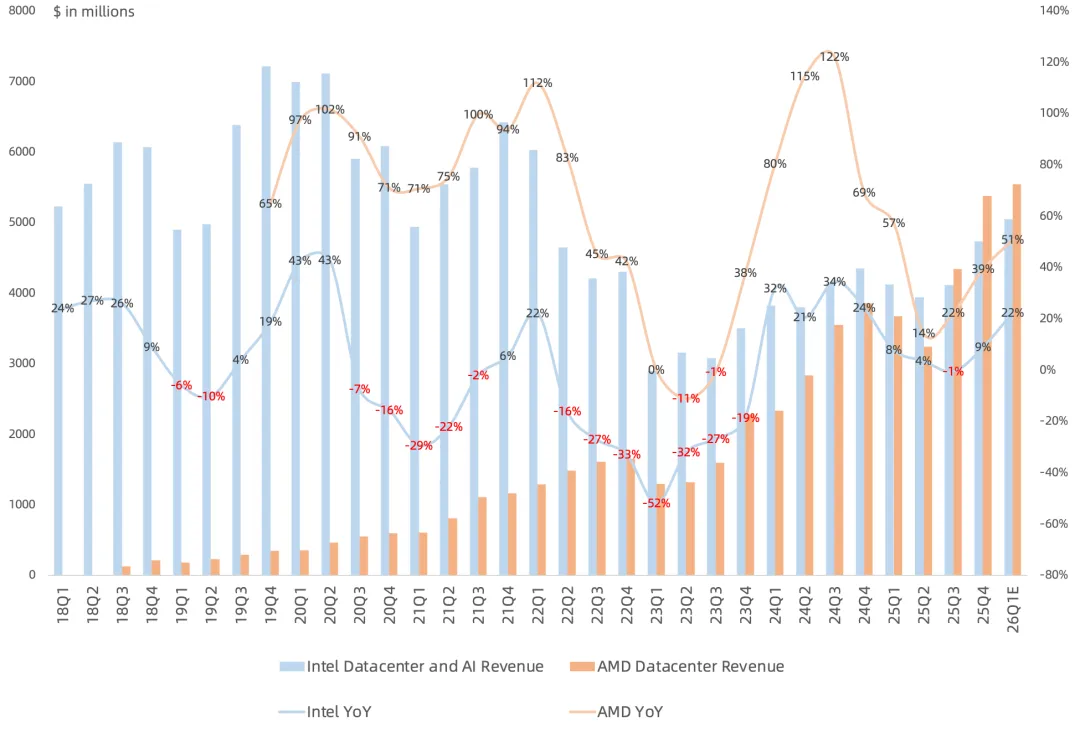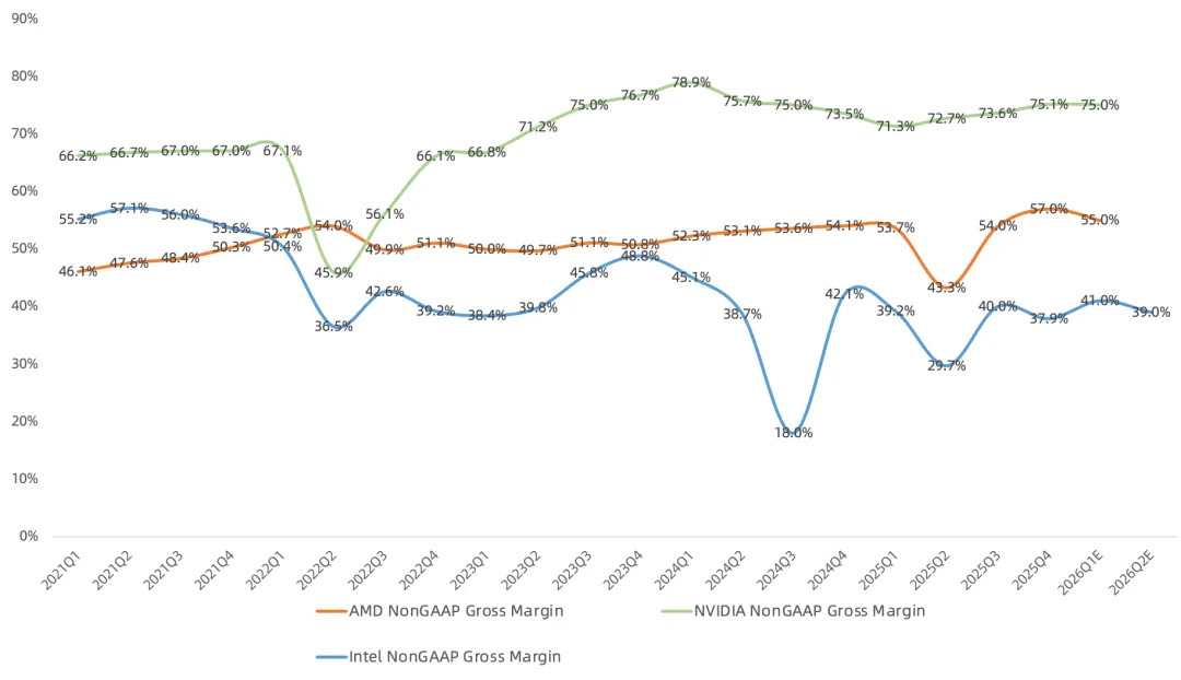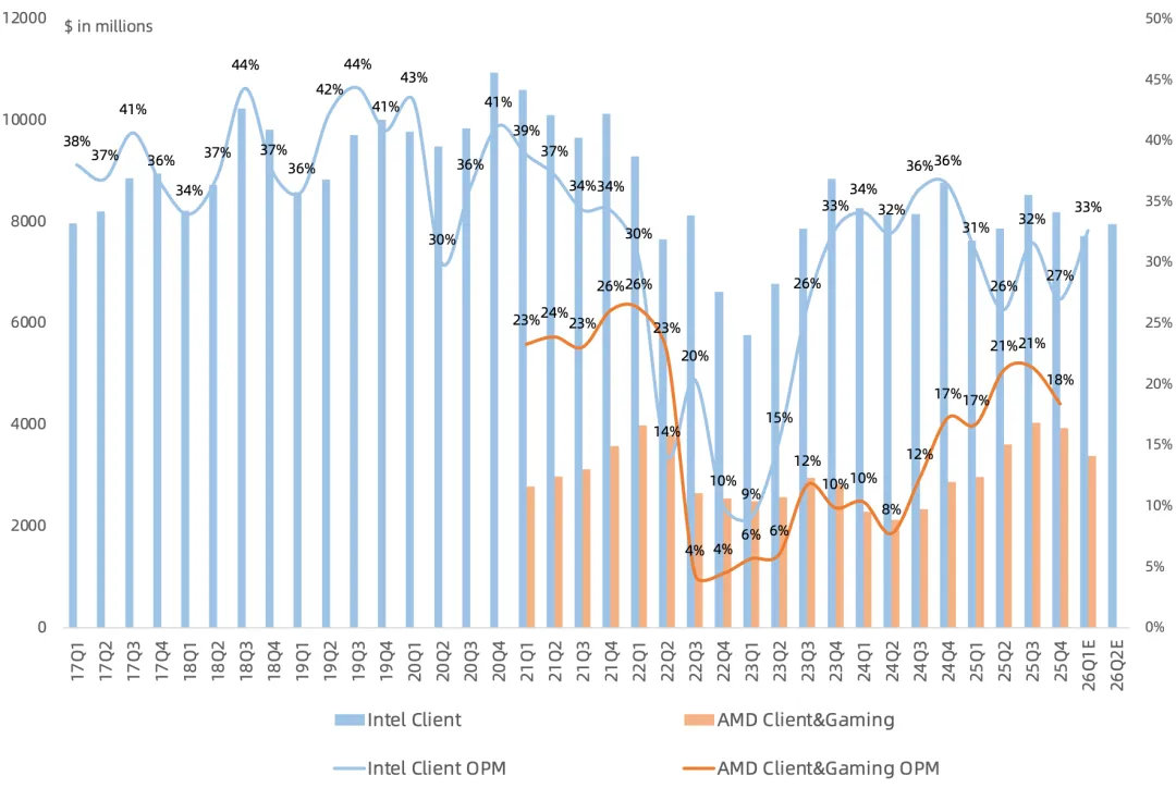 预计Q2 NonGAAP毛利率39%,环比下滑2个百分点,主要被18A放量拖累; 预计2026年营收按上下半年来看,将遵循过去十年的季节性趋势,其中服务器表现将高于季节性,PC表现将低于季节性;