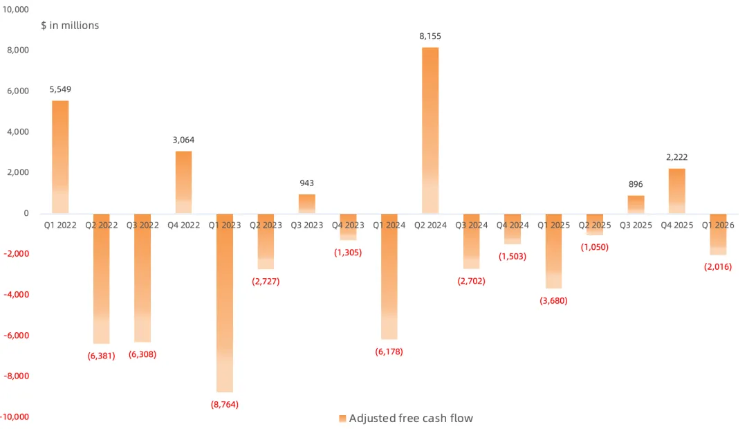 经营现金流11亿美元,调整后自由现金流为负20.2亿美元,截止本季度末公司归母净资产1114亿美元;