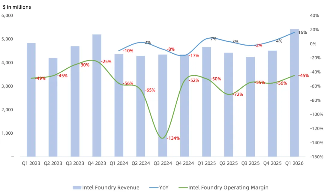 Intel Foundry营收54.2亿美元,同比增长16%,环比增长20%,主要受Intel 3推动的EUV晶圆组合增加以及18A的显著增长带动,其中外部代工营收1.74亿美元,环比下滑22%;经营亏损24.4亿美元,同比亏损放大,环比亏损收窄,经营亏损率45%; Intel 3工艺的Xeon 6和Intel 18A工艺的Core Series 3目前已经进入全面量产爬坡阶段;18A良率现在高于内部预测,在18A-P和14A方面外部客户仍在接触,14A的成熟度、良率和性能,在同一时间点上正在超过18A,与多家客户共同开发PDK,有意加大了14A投资,预计从今年下半年开始将看到更早期的设计承诺出现,并在2027年上半年进一步扩大; 本季度先进封装客户backlog增长,宣布多年期扩建在马来西亚的后端设施,这些需求将从2027年开始转化为收入;预计先进封装未来市场可做到每年数十亿美元,随着时间推移,先进封装的毛利率至少会达到Foundry公司平均水平,或者Foundry平均毛利率。