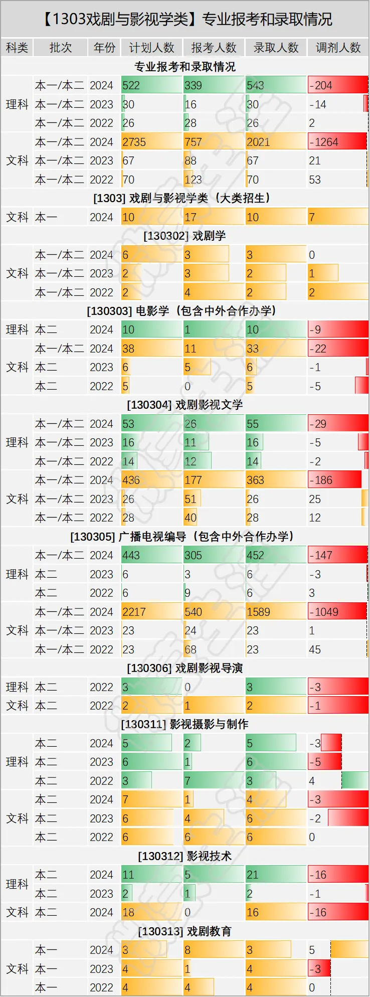理科数据呈现出一个“从无到有、爆发式扩招”的图景:戏剧与影视学类在理科招生规模极小,但2024年突然大幅扩招,报考人数增长滞后,生源缺口巨大。细分专业中,广播电视编导、戏剧影视文学等方向持续负调剂,成为价值洼地;影视技术、电影学等小众方向同样缺人;影视摄影与制作报考热度下降。