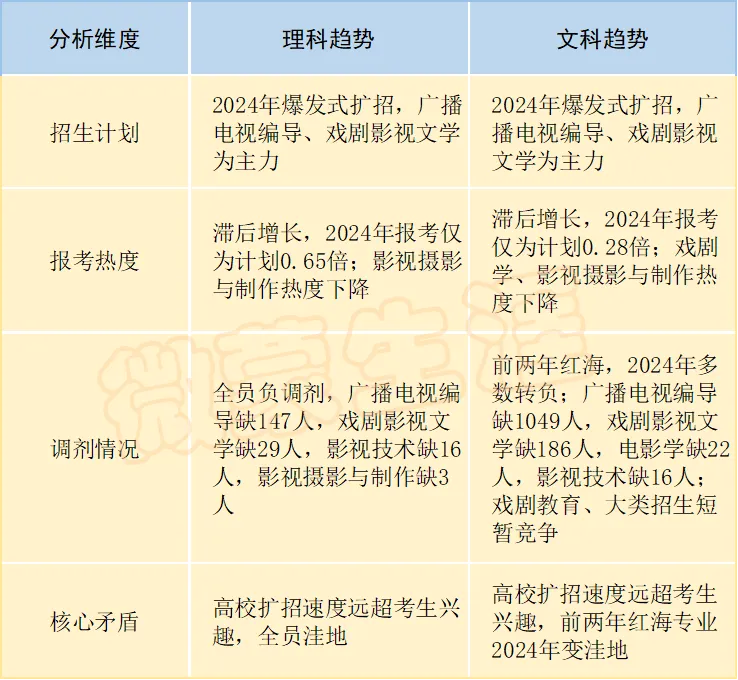 文科的戏剧与影视学类专业,前两年竞争激烈,2024年因计划暴增,生源缺口急剧扩大,广播电视编导、戏剧影视文学等传统热门专业从红海转为洼地;电影学、影视技术等新兴方向持续缺人。