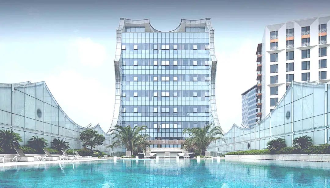 会所立面为曲线波浪状,采用拉丝玻璃材质呈现出圆形窗洞,象征水波和气泡。