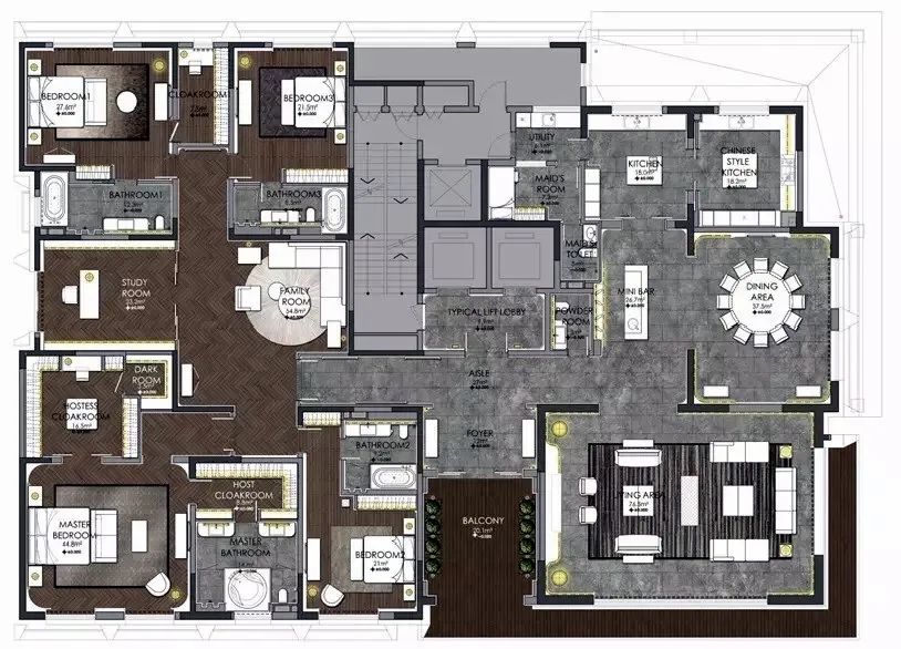 产品的四个卧房均采用全套房设计,所有房间均配置了卫生间和衣帽间,主卧更采用了公寓产品中罕见的男主人和女主人双衣帽间设计。
