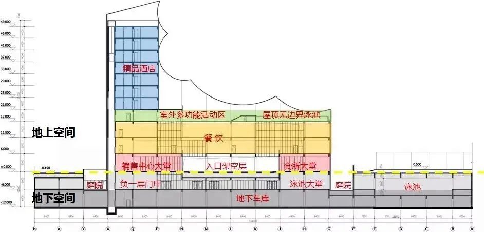 会所分地下两层,地上11层,负二层为地下停车库,负一层为休闲娱乐区,一层大堂入口空间,二三层为餐饮区,四层是屋顶多功能活动场所,五至十一层打造了21间精品酒店式公寓套房。