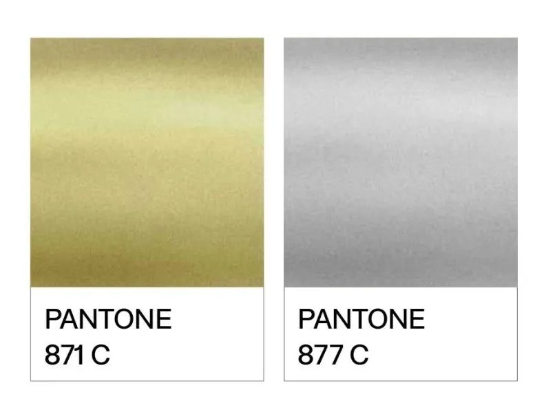 很多印刷品上看到带有金属光泽的颜色,这类颜色从潘通色卡中也能找到,通常是由8开头的3位数金属色。金属色与烫金烫银工艺不同,没有那么强烈的金属质感,因为是印刷上去的质感也更平滑。