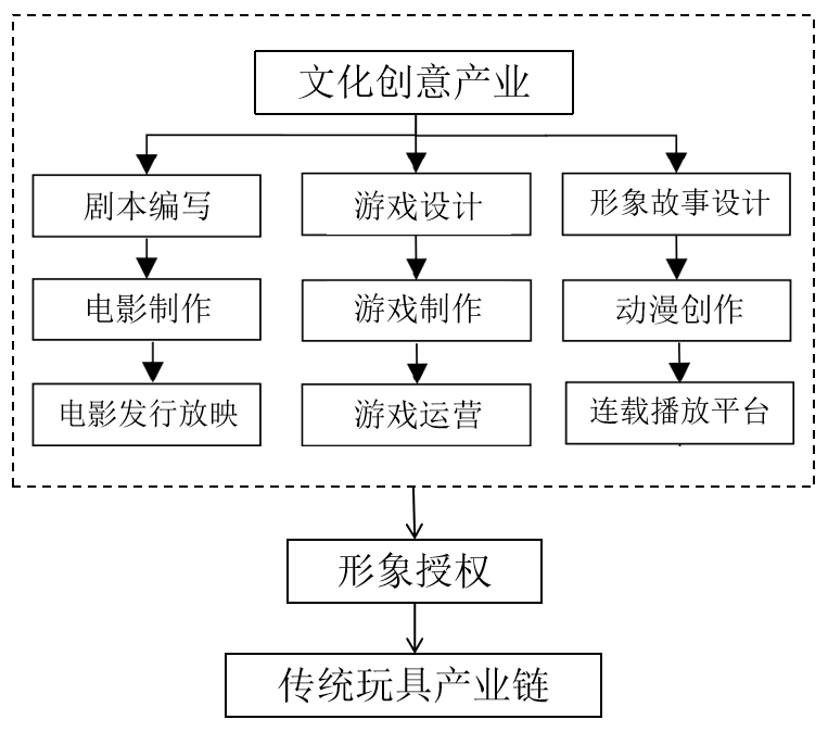 传统产业集群通过产业活动再布局,利用集群外资源、通过与新兴产业的融合或向新兴产业延伸增加产品附加值的创新模式,称为“脱域”模式。21世纪以来,家庭式手工作坊起步的澄海玩具产业集群逐渐形成“脱域”模式。从地域空间看,广州、深圳承担澄海玩具企业在价值链高端的设计、研发、市场开拓等职能,而澄海主要承担玩具生产的职能,区域间进行功能互补的网络合作。从产业拓展看,澄海玩具向影视、动漫、游戏等文化创意产业拓展,实现传统产业与新兴产业融合发展。下图示意文化创意产业与澄海传统玩具产业链的融合。