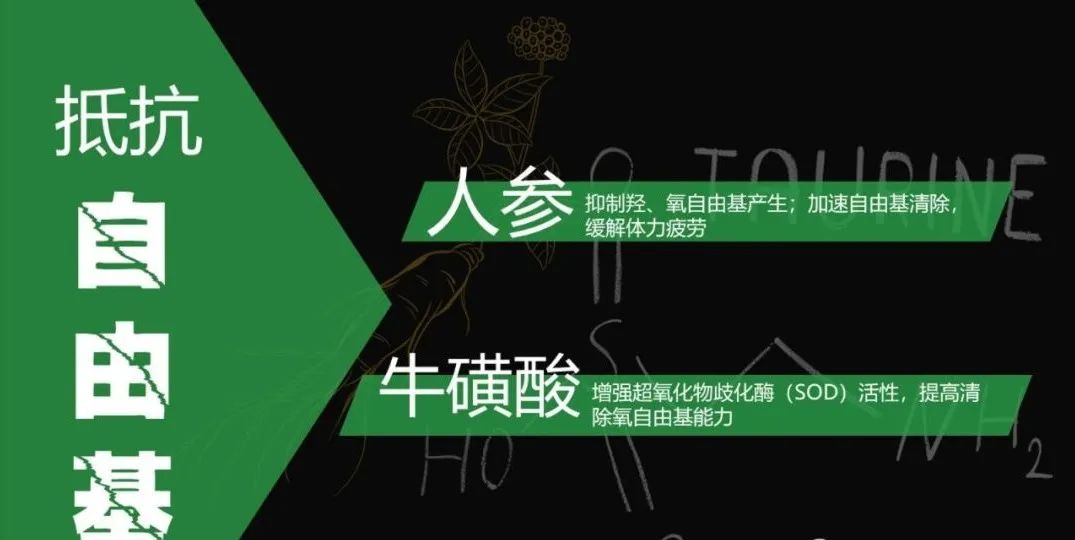 人参:人参皂甙可以通过抑制羟、氧自由基产生、过氧化氢的脂质过氧化作用以及加速自由基清除等途径发挥抗氧自由基的作用, 从而达到缓解体力疲劳的目的。