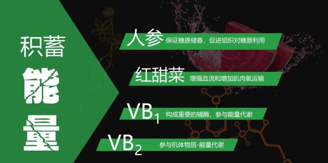 三维一体:结合和参考疲劳产生的机制的主流学说,设计了以能量积蓄、提升代谢、抗氧化为理念的产品配方。