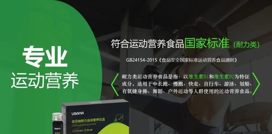 优莎纳耐力运动营养饮品,是专业的运动营养食品,符合运动营养食品的国家标准——《食品安全国家标准运动营养食品通则》。