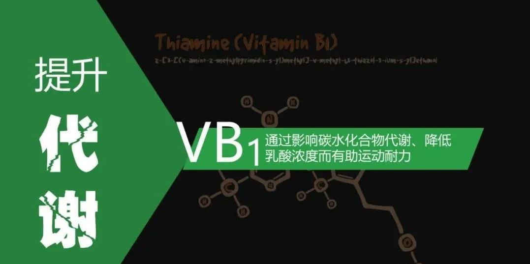 VB1:通过影响碳水化合物代谢、降低乳酸浓度而有助运动耐力。
