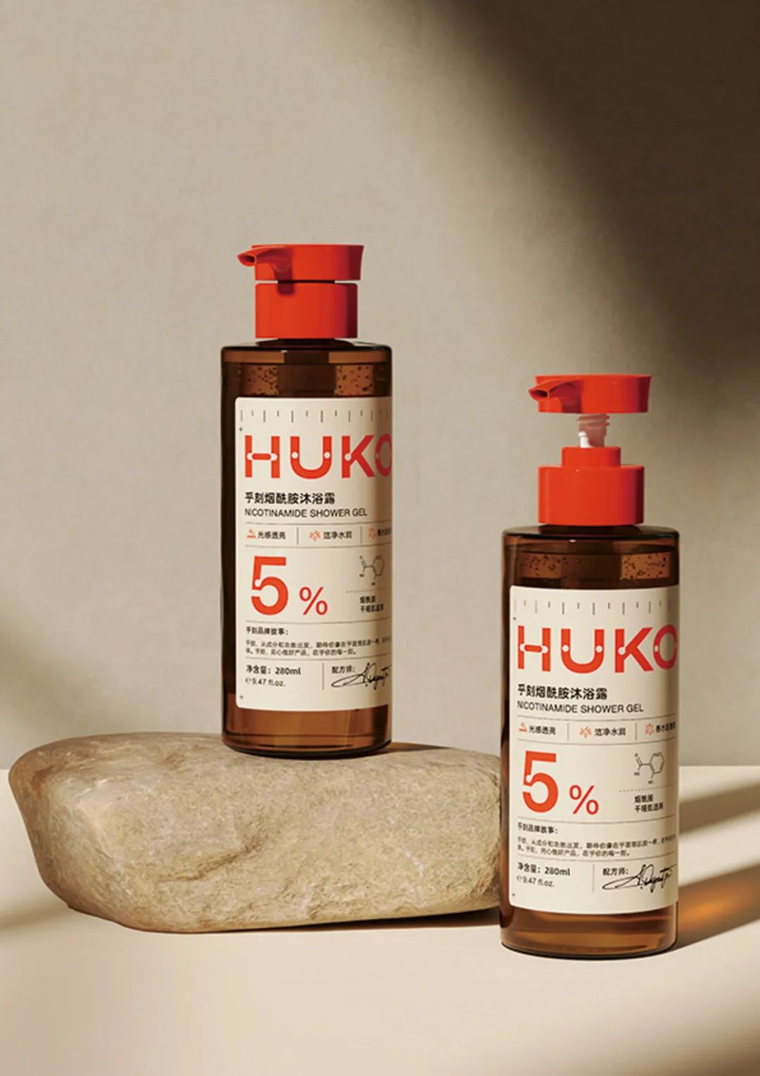 HUKO个人护理系列的包装使用了卡尺的造型外观,文字上方的测量刻度和标签结构的直线是中心元素。所有关于成分和效果的重要信息都清楚简明地显示在标签上,标签可以根据需要进行缩放。
