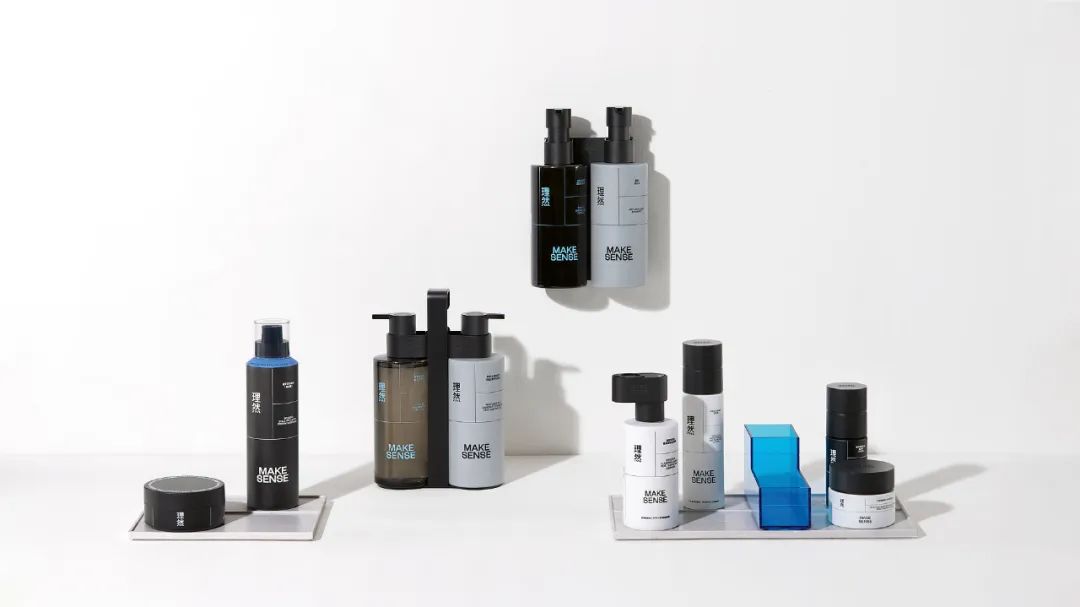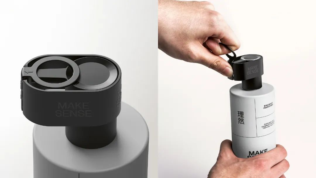 化妆品品牌MakeSense是一个男性身体护理系列,旨在通过其包装提供新的用户体验。该包装不仅拥有醒目的颜色对比和几何图形,还有一个特别引人注目的创新泵分配器,由于有一个大拉环,即使湿手也可以轻松打开,这款拉环还可用作悬挂装置,方便收纳。当泵头完全按下时,用户会听到清晰的咔哒声,精简的设计贴合男性消费者消费习惯。