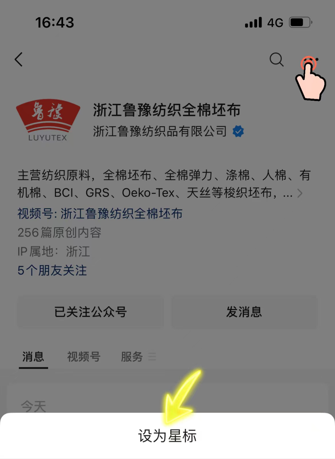 1.打开浙江鲁豫纺织全棉坯布公众号点击右上角“...”