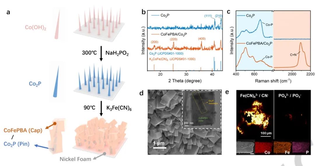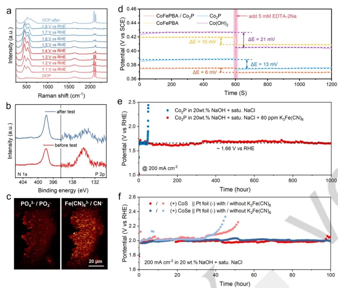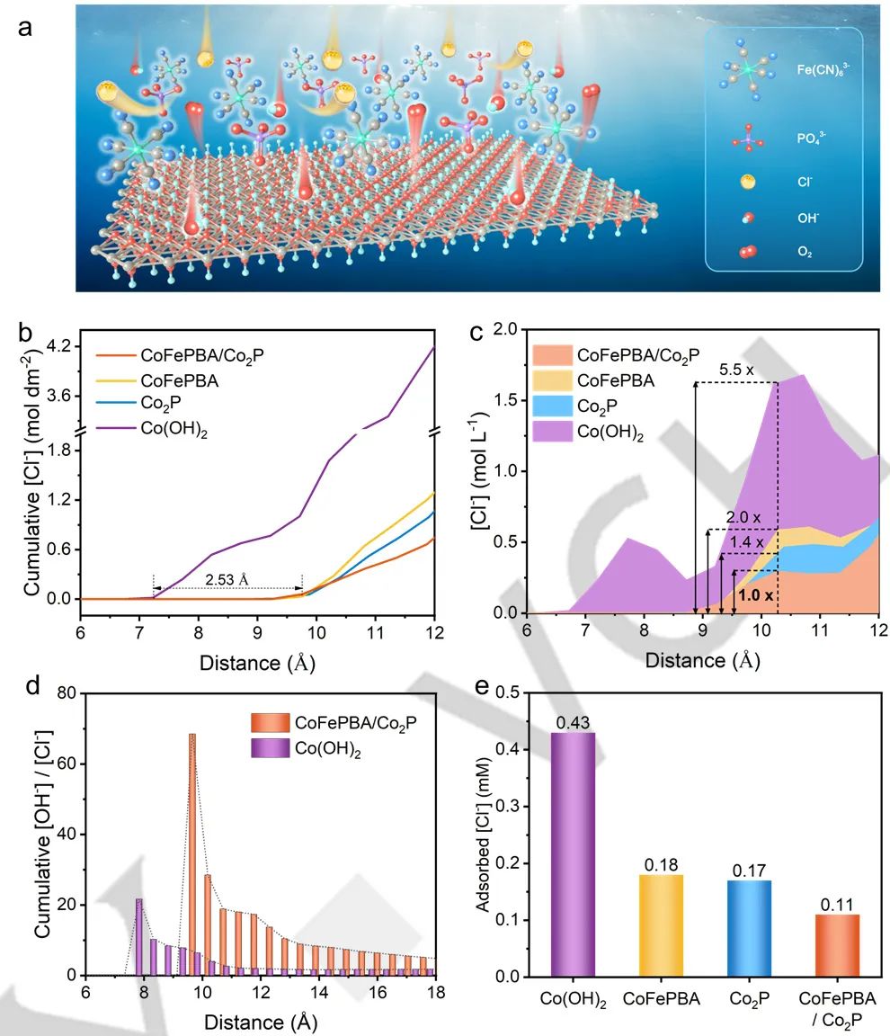 在高电流密度和低过电位条件下直接进行海水电解是生产清洁和可再生氢燃料的有效策略。然而,在连续注入海水的情况下,Cl-饱和会导致阳极被严重腐蚀,这严重阻碍了电解过程。基于此,北京化工大学孙晓明教授(通讯作者)课题组合成了具有帽/针状结构的铁氰化钴/磷化钴(CoFePBA/Co2P)阳极,它能在200-2000 mA·cm-2条件下稳定催化碱性饱和盐水氧化反应数百小时而不发生腐蚀。结合实验结果,分子动力学模拟显示,电极产生的 PO43- 和 Fe(CN)63- 通过静电排斥和致密覆盖在排斥 Cl- 方面发挥了协同作用,使 Cl- 吸附量减少了近 5 倍。这种新型阴离子协同作用为电极提供了卓越的腐蚀保护,有望促进盐水电解的实际应用。盐水占世界水资源的近 96.5%,是电解制氢的理想原料,可避免淡水资源的匮乏。然而,在盐水电解过程中,Cl离子(通常为 0.5 M)可能会被吸附和氧化,导致电极表面腐蚀,并产生对环境有害的 Cl2/ClO-。鉴于氧气生成反应(OER)的选择性和反应动力学不断加快,在海水中引入碱性(1M KOH 或 1M NaOH)会产生深远的影响,因为在 pH 值大于 7 时,OER 的标准氧化还原电位比氯氧化反应(ClOR)的标准氧化还原电位低 480 mV。然而,持续向电解槽中注入海水往往会使 Cl-([Cl-])的浓度增加至饱和浓度(约 5.3 M),从而导致更严重的腐蚀。为了缓解这一问题,相关研究证明将电解液中的碱性物质从 KOH 替换为 6 M NaOH,其中的共离子效应显著降低了 NaCl 的溶解度,从而使净[Cl-]达到 2.8 M。迄今为止,人们已经做出了巨大努力来解决观察到的瓶颈问题,即盐水电解过程中电极稳定性差的问题。最近的开创性工作表明,利用 CuMo6S8/Cu 和 Pt/NiMo 电极可在安培级电流密度下实现稳定的析氢反应。然而,在海水电解过程中,阳极的氧生成反应受限于 200-600 mA·cm-2 的电流密度,这是由于在阳极上吸附Cl-而引起的腐蚀导致。众所周知,氮化物、磷化物、硫化物和硒化物等多种电极会发生原位表面转化,在氧化时生成带负电荷的阴离子层,从而排斥 Cl-,保护阳极免受腐蚀。例如, NiFe LDH/NiSx/Ni 泡沫电极和 NiMoN@NiFeN 电极可在 1.5 M NaCl 电解液中以 0.6 A·cm-2 的电流密度稳定工作。遗憾的是,持续注入海水会导致 NaCl 饱和,并加强高电流密度下的 Cl- 腐蚀,这可能会阻碍海水电解的进一步发展。这就需要开发一种新的策略,在盐水电解过程中保护阳极免受腐蚀。图1. CoFePBA/Co2P 电极的合成和表征。(a) CoFePBA/Co2P 电极的合成路线示意图。(b) Co2P 和 CoFePBA/Co2P 的 XRD 图。(c) Co2P和CoFePBA/Co2P 的拉曼光谱图。(d) CoFePBA/Co2P 的扫描电子显微镜(SEM)图像。插图为 TEM 图像。(e) CoFePBA/Co2P 中 Fe(CN)63-/CN-和 PO43-/PO3-的 TOF-SIMS 图谱,以及 CoFePBA/Co2P 中 Co、Fe 和 P 的 EDX 元素图(比例尺:20 μm)。CoFePBA/Co2P 帽/针状电极(泡沫镍基底上的帽状 K2CoFe(CN)6 和针状 Co2P 复合材料)是通过三步法合成的:在导电泡沫镍上水热生长 Co(OH)2 纳米针,然后用 NaH2PO2 磷化,得到 Co2P 纳米针。最后,在 K3Fe(CN)6 溶液中对合成的 Co2P 纳米针进行二次水热处理,得到 CoFePBA/Co2P 帽/针状复合材料。图2. 盐水电氧化性能。(a) 在 1 M NaOH + 0.5 M NaCl 中的极化曲线。(c) 在含有 20 wt.% NaOH + 饱和 NaCl 的电解液中 200 mA·cm-2 时的 CP 响应。(d) 在含有 20 wt.% NaOH + 饱和 NaCl 和 20 wt.% NaOH + 实际海水的电解液中 1 A·cm-2 时的 CP 响应。(e) 在含有 20 wt.% NaOH + 饱和 NaCl 的电解液中,2 A·cm-2 时的 CP 响应。在标准三电极配置的电化学电池中,利用常规碱性海水电解质(1 M NaOH + 0.5 M NaCl)和碱性饱和盐水电解质(20 wt.% NaOH + 饱和 NaCl)测量了合成的 CoFePBA/Co2P电极的 OER 性能。图3. 离子协同作用的实验验证。(a) CoFePBA/Co2P 在 20 wt.% NaOH + 饱和 NaCl 溶液中不同电位下的原位拉曼光谱图。(b) CoFePBA/Co2P中N 1s和P 2p在20wt .% NaOH +饱和NaCl中时间电位测定前后的高分辨率XPS光谱图。(c) CoFePBA/Co2P 在 20 wt% NaOH + 饱和 NaCl 中活化后 CoFePBA/Co2P 电极表面的 PO3- 和 CN- 片段的 TOF-SIMS 图谱。初始测试在 1 M NaOH 溶液中进行 600 秒,600 秒后加入 0.5 mM EDTA-2Na。(e) Co2P 样品在 20 wt.% NaOH + 饱和 NaCl 电解液中(添加和未添加 80 ppm (0.24 mM) K3Fe(CN)6)200 mA· cm-2 的计时电位曲线。(f) (+)CoS||铂箔(-)和(+)CoSe||铂箔(-)在 20 wt.% NaOH + 饱和 NaCl 溶液(含或不含 80 ppm (0.24 mM) K3Fe(CN)6)中 200 mA· cm-2 的计时电位曲线。带负电荷的阴离子层可以排斥 Cl-,从而保护电极免受腐蚀。有资料表明,这种排斥力的强弱主要与静电排斥力和电极表面覆盖率有关。Co2P(由较小半径的 PO43- 保护)和 CoFePBA(由较大半径的 Fe(CN)63- 保护)都无法提供一个坚固的催化剂表面,以促进饱和盐水中的 OER 催化。然而,当使用 CoFePBA/Co2P 盖/针电极时,会产生PO43-/ Fe(CN)63-合并层。PO43的半径较小,具有强大的静电排斥力。然而,Fe(CN)63-的尺寸较大,可以弥补PO43-覆盖率低的缺点。因此,CoFePBA/Co2P电极可在饱和盐水中长期工作而不会腐蚀。图4. 离子协同作用的理论验证。(a) 离子协同作用示意图。(b) 累积 Cl- 浓度随垂直于不同样品的位置(距离)变化曲线。(c) Cl-浓度随垂直于不同样品的位置(距离)变化曲线。(d) Cl- 和 OH- 的累积浓度比较。(e) 不同电极在 6 mM NaOH + 2.8 mM NaCl 溶液中吸附 Cl- 的量,该量由离子色谱法测定。为了深入探讨重构 CoFePBA/Co2P 电极所产生的 PO43- 和 Fe(CN)63- 的协同效应,作者进行了经典的分子动力学模拟。利用 CoHO2 表面建立了重构 Co(OH)2、Co2P、CoFePBA 和 CoFePBA/Co2P 的模型。综上所述,作者合成了具