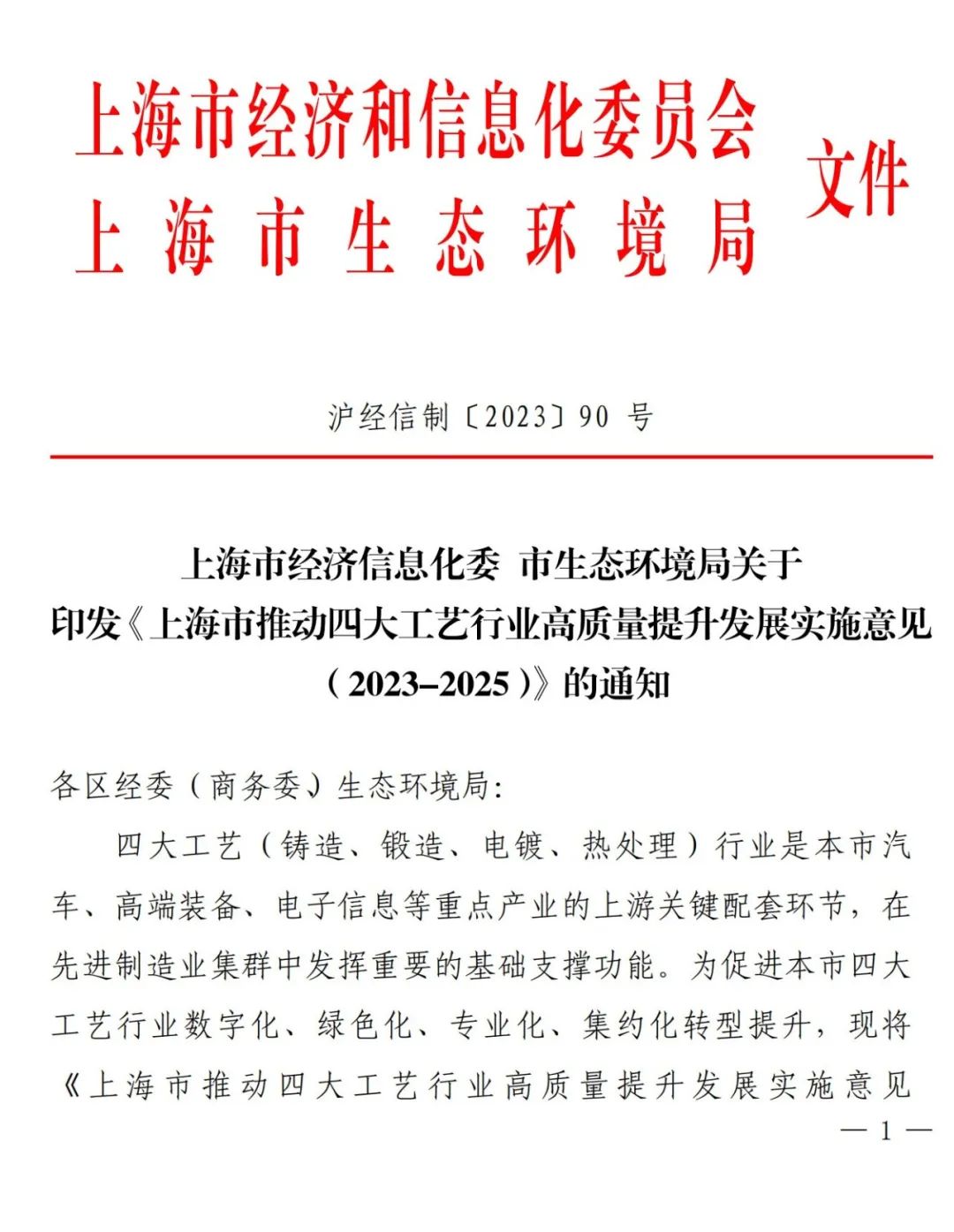 实施意见提出,四大工艺(铸造、锻造、电镀、热处理)行业是汽车、高端装备、电子信息等重点产业的上游关键配套环节,是上海发展先进制造业不可或缺的坚实支撑,是产业链供应链坚强稳定的基础保障。