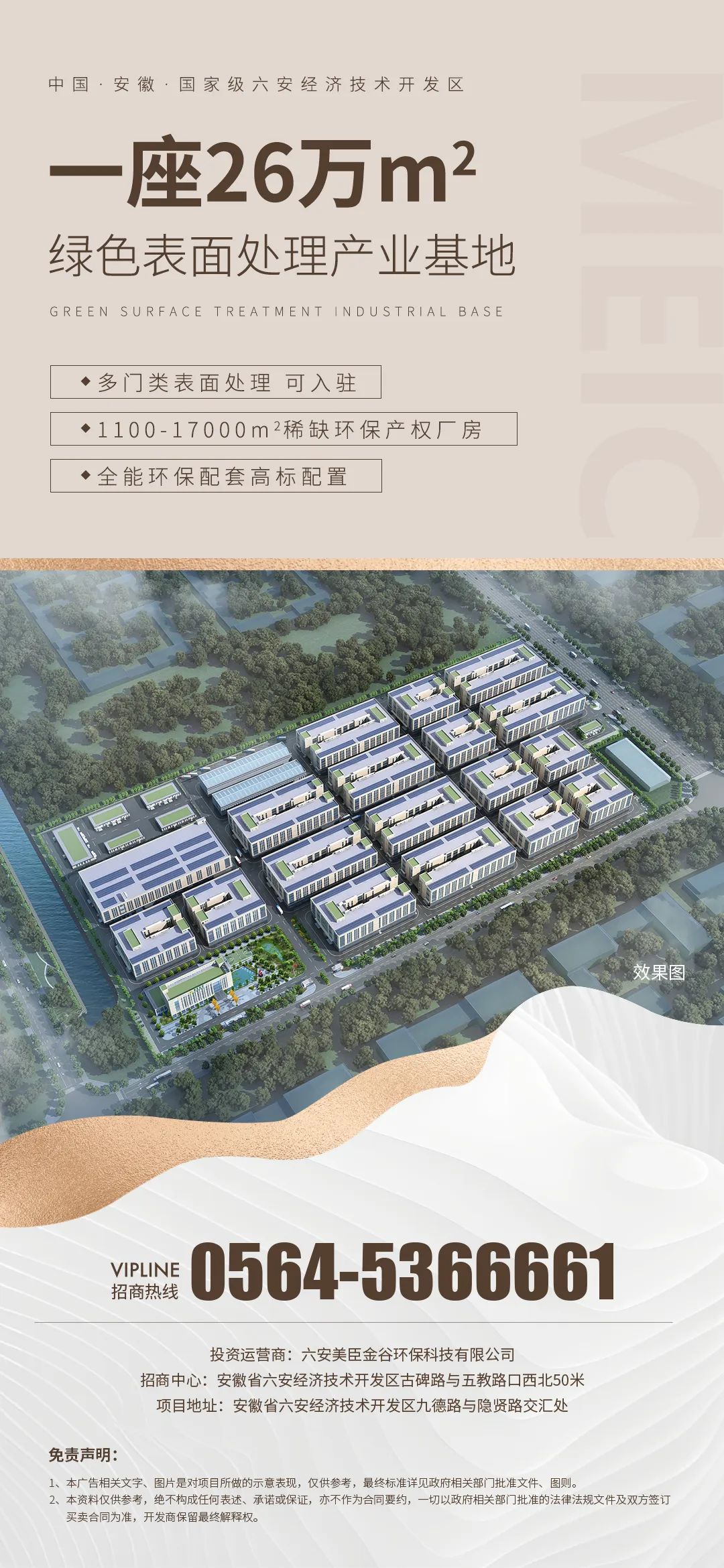 园区围绕表面处理企业需求,以“构筑园区载体,强化产业服务、推动表面处理产业升级”为发展理念,联手国内顶尖的环保产业园专业设计单位,打造全新4.0工艺绿色表面处理厂房;园区规划建设环保标准化厂房及废水处理中心、风控应急指挥中资源化中心、危化品仓、危固废暂存中心、运营服务中心等。主要招引新能源汽车零部件及智能制造等多门类电镀及表面处理企业,以最高标准的配置,最领先的环保技术,助力企业安全、稳定、高效发展。