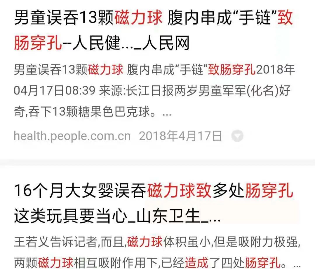 搜索“磁力球导致肠穿孔”,发现此类案例好多,“男孩嘴馋,吞食玩具磁球导致肠穿孔”,“磁力球再闯祸,2龄童误吞13颗后肠穿孔”、“1岁女婴误吞俩磁力球肠穿孔,危险玩具千万别给孩子玩”。