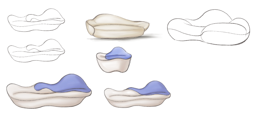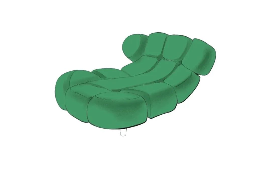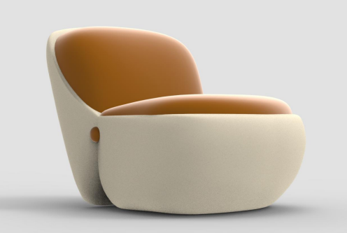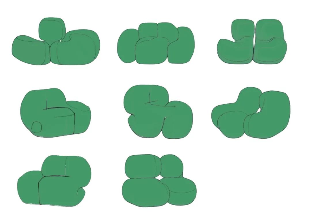 侯懿夫在草图阶段创作了五六个作品,深入演示的有三四个,其中《Keke》是他个人较为满意的单人沙发作品。沙发的形态提炼自现在年轻人喜欢养的植物生石花,颜色偏向于流行的多巴胺,加上材料光滑的质感,整体给人一种敦厚饱满、柔软舒适的感觉。