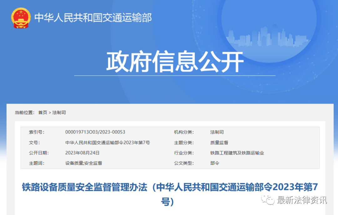 《铁路设备质量安全监督管理办法》已于2023年7月21日经第14次部务会议通过,现予公布,自2023年9月1日起施行。第一条为了加强铁路设备质量安全监督管理,保障铁路运营安全,根据《中华人民共和国安全生产法》《中华人民共和国产品质量法》《中华人民共和国铁路法》《铁路安全管理条例》等法律、行政法规,制定本办法。第二条中华人民共和国境内的铁路设备质量安全监督管理工作,适用本办法。第三条铁路设备质量安全监督管理应当坚持安全第一、预防为主、综合治理的方针,保证铁路设备全寿命周期质量安全。第四条铁路设备生产企业和铁路运输企业应当加强铁路设备质量安全管理,落实质量安全管理责任,建立健全质量安全管理制度,依法设置质量安全管理机构或者配备质量安全管理人员,执行保障质量安全的国家标准、行业标准、技术规范,保证质量安全管理所必需的资金投入,确保投入使用的铁路设备符合质量安全要求。设计、制造、维修或者进口新型铁路机车车辆,生产铁路道岔及其转辙设备、铁路信号控制软件和控制设备、铁路牵引供电设备的企业,应当依法取得相应许可。第五条国家铁路局按照职责开展全国铁路设备质量安全监督管理工作,地区铁路监督管理局按照职责开展辖区内铁路设备质量安全监督管理工作。第六条鼓励铁路设备生产企业和铁路运输企业技术创新,推行科学的质量管理方法,采用先进的科学技术,提升铁路设备质量,保障铁路运输安全。第七条铁路设备生产企业应当遵守有关产品质量安全的法律、行政法规、规章和国家标准、行业标准、技术规范,保证生产的铁路设备产品质量合格。第八条设计新型铁路机车车辆、铁路道岔及其转辙设备、铁路信号控制软件和控制设备、铁路牵引供电设备等铁路设备,应当经检验检测、型式试验、运用考核和技术评审等环节,满足安全、可靠和可维修要求。第九条铁路设备生产企业应当建立并执行铁路设备生产过程控制、质量检验、不合格品管理、人员管理、原材料及零部件采购管理和供应商评价、全寿命周期技术状态及可追溯管理等质量安全管理相关制度,真实、准确、完整记录铁路设备的质量安全管理和从业人员培训等情况并妥善保存。铁路设备生产企业不得生产国家明令淘汰或者不符合保障人体健康和人身、财产安全的国家标准、行业标准和技术规范的铁路设备。第十条铁路设备生产企业应当向用户提供必要的基本技术资料和技术培训服务,交付时应当按照约定随附基本技术资料。前款所称基本技术资料,包括但不限于铁路设备的安装或者维修技术图纸、安装及使用、维修说明等。使用、维修说明至少应当包含该铁路设备设计寿命、维修周期、维修范围和技术要求等相关内容。第十一条铁路设备生产企业应当建立产品售后服务管理制度,建立健全售后服务体系,在设计寿命周期内提供售后服务,研究解决铁路运输企业反映的产品质量问题,依法承担产品质量责任。产品存在缺陷的,应当按照缺陷产品召回相关规定执行。第十二条铁路设备生产企业应当每季度向所在辖区铁路监管部门报告生产销售的、质量保证期内的许可产品质量安全相关事故情况,依法向国家铁路局统计机构报送统计资料。第十三条铁路运输企业应当加强铁路设备的使用和维修管理工作,制定相关管理制度,确保使用和维修的铁路设备质量安全满足技术要求。第十四条铁路运输企业应当建立并执行铁路设备使用和维修技术管理、质量管理、委外维修、动态监测、技术状态评价或者鉴定、寿命和报废管理、工装设备管理、铁路设备及零部件采购管理和供应商评价等质量安全管理相关制度,真实、准确、完整记录铁路设备的质量安全管理情况并妥善保存。超过铁路运输企业规定的使用寿命,且未经铁路运输企业技术鉴定或者经技术鉴定确认已达到报废条件的铁路设备,或者应当淘汰的危及安全生产的铁路设备,不得继续使用。铁路运输企业不得采购、使用不具备许可条件的生产企业生产的铁路设备。第十五条铁路运输企业应当依据有关产品质量安全的法律、行政法规、规章和国家标准、行业标准、技术规范,以及安装或者维修技术图纸,安装和使用、维修说明等技术资料,结合实际制定并执行铁路设备使用和维修技术规则。技术规则应当至少明确铁路设备的使用条件、维修周期及标准、维修方式、维修项目、作业标准、维修质量检验项目及标准等相关内容。铁路运输企业编制铁路设备使用和维修技术规则等重要技术文件,应当经技术论证、评审等环节,并根据铁路发展实际及时修订完善,满足使用和维修工作需要。第十六条铁路运输企业应当加强运输高峰期、汛期、恶劣天气等特殊时期和特殊区段铁路设备的使用和维修管理,制定相关制度、应急预案和安全保障措施并组织实施。第十七条铁路运输企业应当建立健全铁路设备质量安全风险分级管控和隐患排查治理双重预防机制,制定质量安全隐患排查年度计划及排查清单并组织实施。铁路设备质量安全隐患排查治理情况应当如实记录,建立档案并妥善保存。第十八条铁路运输企业应当建立并执行支持铁路设备技术创新及上线运行(运用)考核的相关管理制度,加强新型铁路机车车辆、铁路道岔及其转辙设备、铁路信号控制软件
