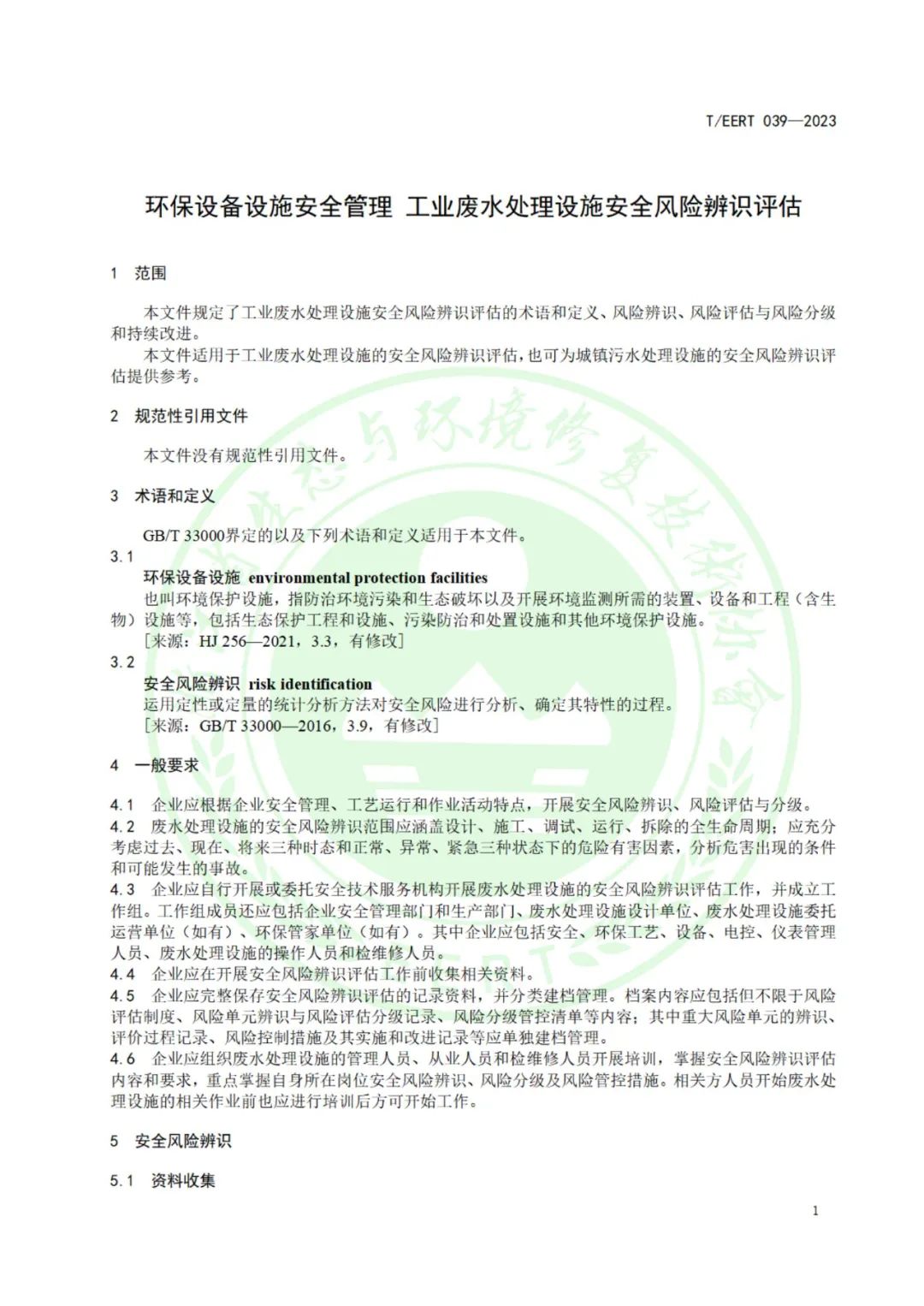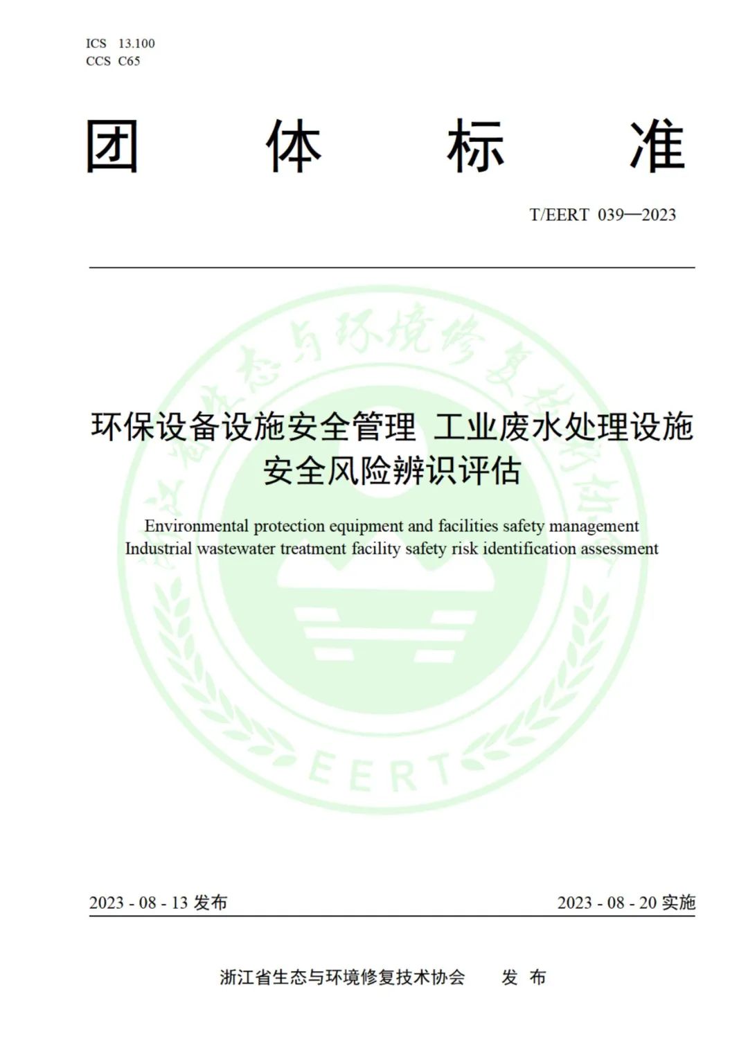 环保有个号消息:近日,浙江省生态与环境修复技术协会批准 T/EERT 039- 2023《环保设备设施安全管理 工业废水处理设施安全风险辨识评估》团体标准于2023年8月13日发布,自2023年8月20日起实施。(全文如下,仅供学习交流)