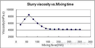 在搅拌过程中,一般认为粘度小于5Pa.s的为低粘度流体,例如:水、蓖麻油、饴糖、果酱、蜂蜜、润滑油重油、低粘乳液等;5-50Pas的为中粘度流体,例如:油墨、牙膏等;50-500Pas的为高粘度流体,例如口香糖、增塑溶胶、固体燃料等;大于500Pas的为特高粘流体例如:橡胶混合物、塑料熔体、有机硅等。浆料内固体物质的含量百分比,理论配比固含量小于出货固含量1)粘度法:从体系不同位置取样,用粘度计测量浆料的粘度;偏差越小,混合越均匀;A,从体系不同位置取样,用颗粒度刮板仪观察浆料的颗粒度;粒度越接近原材料粉末大小,混合越均匀;B,从体系不同位置取样,用激光衍射颗粒度测试仪观察浆料的颗粒度;粒度分布越正态,大颗粒越小,混合越均匀;3)比重法:从体系不同位置取样,测量浆料的密度,偏差越小混合越均匀1)固含量法(宏观):从体系不同位置取样,经过适当的温度和时间的烘烤,测固体份的重量,偏差越小混合越均匀;2)SEM/EPMA(微观):从体系不同位置取样,涂布到基材上,烘干,用SEM(电子显微镜) /EPMA(电子探针)观察浆料干燥后膜片内颗粒或元素的分布;(体系固体份通常为导体材料)Conductive carbon black(导电碳黑):用做导电剂。作用:连接大的活性物质颗粒使导电性良好。Copolymer latex --SBR(丁苯橡胶):用作粘接剂。化学名:Styrene-Butadiene copolymer latex(聚苯乙烯丁二烯乳胶),水溶性乳胶,固含量48~50%,PH 4~7,凝固点-5~0℃,沸点大约100℃,储存温度5~35℃.SBR是一种阴离子型聚合物分散体,具有良好的机械稳定性及可操作性,并具有很高的粘结强度。Sodium carboxymethyl cellulose(CMC)-- (羧甲基纤维素钠):用作增稠剂和稳定剂。外观为白色或微黄色絮状纤维粉未或白色粉未,无嗅无味,无毒;易溶于冷水或热水,形成胶状,溶液为中性或微碱性,不溶于乙醇、乙醚、异丙醇、丙酮等有机溶剂,可溶于含水60%的乙醇或丙酮溶液。有吸湿性,对光热稳定,粘度随温度升高而降低,溶液在PH值2~10稳定,PH低于2,有固体析出,PH高于10粘度降低。变色温度227℃,炭化温度252℃,2%水溶液表面张力71mn/n。Conductive carbon black(导电碳黑):用做导电剂。作用:连接大的活性物质颗粒使导电性良好。