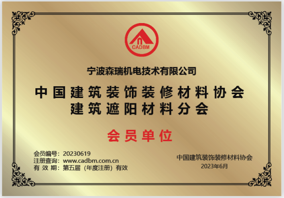 2023年6月,宁波森瑞机电技术有限公司正式加入中国建筑装饰装修材料协会建筑遮阳材料分会(简称“中装材协建筑遮阳材料分会”),成为中装材协建筑遮阳材料分会会员单位。