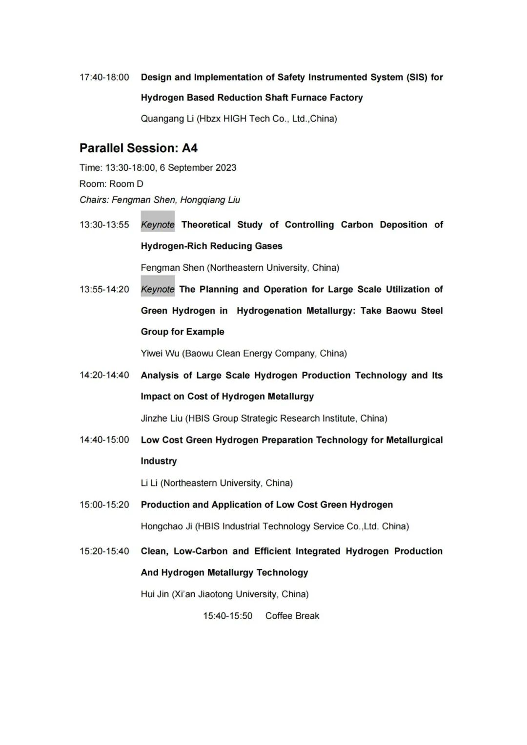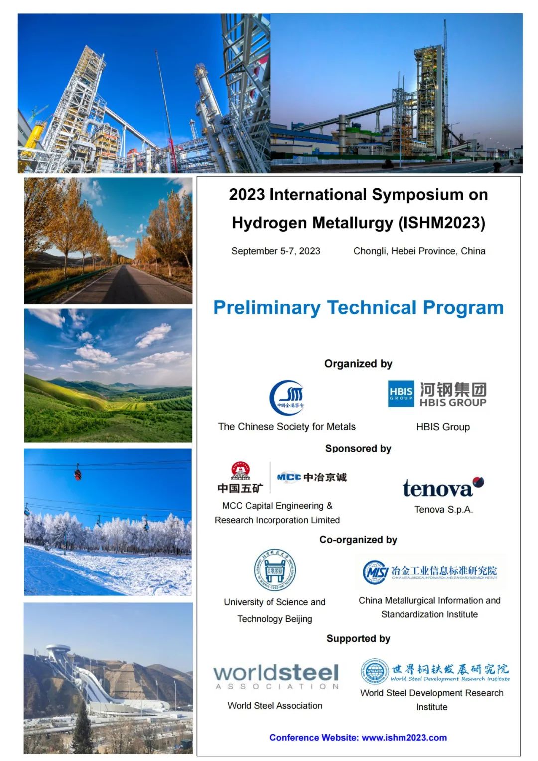 由中国金属学会和河钢集团共同主办的 “2023年氢冶金国际研讨会”将于2023年9月5日至7日在河北省崇礼召开,本届会议组委会收到了来自澳大利亚、奥地利、比利时、巴西、加拿大、德国、日本、韩国、瑞典、英国、中国等11个国家及地区的著名专家学者和科研人员的论文110余篇(其中国外论文30余篇)。经过技术委员会评审,现将此次会议的技术日程发布。为了便于您提前了解会议的学术安排,烦请阅读以下温馨提示:1、口头宣讲报告人请提前准备好ppt文件,ppt文件比例为16:9;2、会议工作语言为英语,大会特邀报告(9月5日全天和9月6日上午)将提供同声翻译;3、会议墙报尺寸:0.9m(宽)×1.2m(高)。会议不接受A4、A3打印纸拼接的墙报,墙报作者请在茶歇期间在墙报区域回答参观者提出的问题;6、会议现场请保持安静,手机请保持静音,未经主办方及报告人同意,请不要拍照及录制视频;7、9月初崇礼昼夜温差较大,请您及时查询当地实时天气状况,备好衣物。