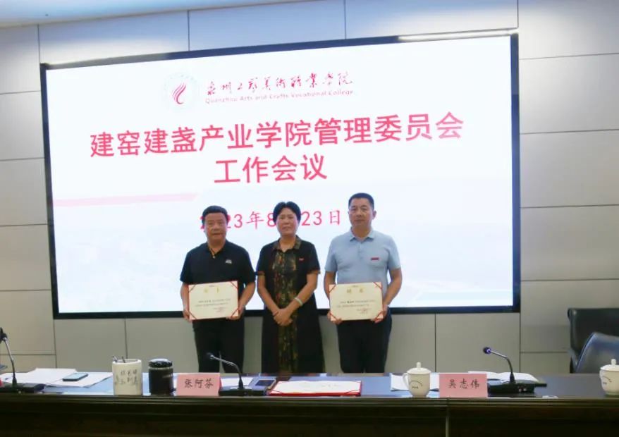 8月23日下午,我校召开建窑建盏产业学院工作会议,研究推进建窑建盏产业学院工作。学院院长张阿芬,南平市农业学校校长刘卫东,南平市建阳区城镇集体工业联合社主任陈辉,南平市建阳区工业和信息化局党组成员、总经济师叶颖辉,南平市建阳区建窑建盏协会副会长孙福昆等共建单位负责人以及行业企业、客座教授代表出席会议。会议由吴志伟副院长主持。