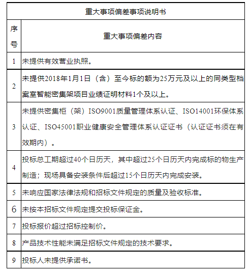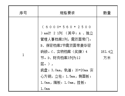 1. 投标人具有独立订立合同的能力,具备有效营业执照(须提供企业营业执照副本复印件并加盖公章,原件备查)。2. 投标人为制造厂家须提供密集柜(架)ISO9001质量管理体系认证、ISO14001环保体系认证、ISO45001职业健康安全管理体系认证证书,认证证书须在有效期内(复印件加盖公章,原件备查)。3. 投标人具有2018年1月1日(含)至今标的额为25万元及以上的同类型档案室智能密集架项目业绩证明材料1个及以上(提供中标通知书或合同复印件加盖公章,原件备查)。(1)未处于被责令停业、投标资格被取消或者财产被接管、冻结和破产状态;(2)企业没有因骗取中标或者严重违约以及发生重大工程质量、安全生产事故等问题,被有关部门暂停投标资格并在暂停期内的;(3)投标人近3年内没有行贿犯罪行为,未被“信用中国”网站(www.creditchina.gov.cn)或“中国政府采购网”网站(www.ccgp.gov.cn)列入失信被执行人、重大税收违法案件当事人名单、政府采购严重失信行为记录名单。5. 投标人之间有下列情形之一的,不得同时参与该项目投标:(1)法定代表人为同一个人的两个或者两个以上企业法人。(4)单位负责人为同一人或者存在控股、管理关系的不同单位。(1)智能密集货架钢制部分材料规格、技术参数、标准