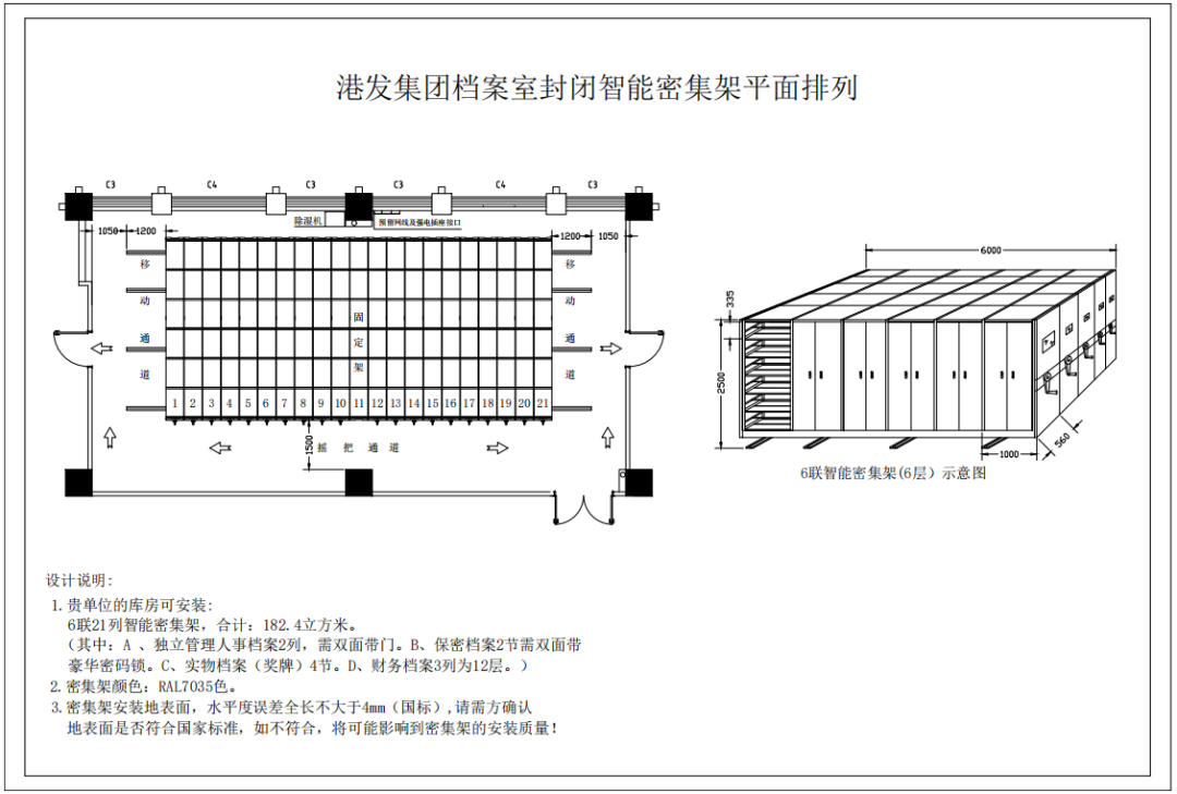 为进一步规范集团档案工作管理水平,我司须采购档案室智能密集架。本项目立项已完成,资金已落实,具备招标条件。本项目采用企业自主公开招标,发布媒体为镇江市港口发展集团有限公司门户网站和微信公众号。欢迎符合条件的潜在投标人参与投标。1. 项目名称:镇江市港发集团有限公司档案室设备设施采购及安装工程。2. 交货地点:五凤口路10号官塘绿苑四区17栋701室。档案室设备设施包括密集架的采购及安装;轨道基础施工(不含开槽)。六联全封闭智能档案密集架(含轨道)21列,约182.4立方米(其中A.独立管理人事档案2列,需双面带门。B.保密档案2节需双面带豪华密码锁。C.实物档案(奖牌)4节。D.财务档案3列为12层)。具体内容详见图纸及工程量清单。
