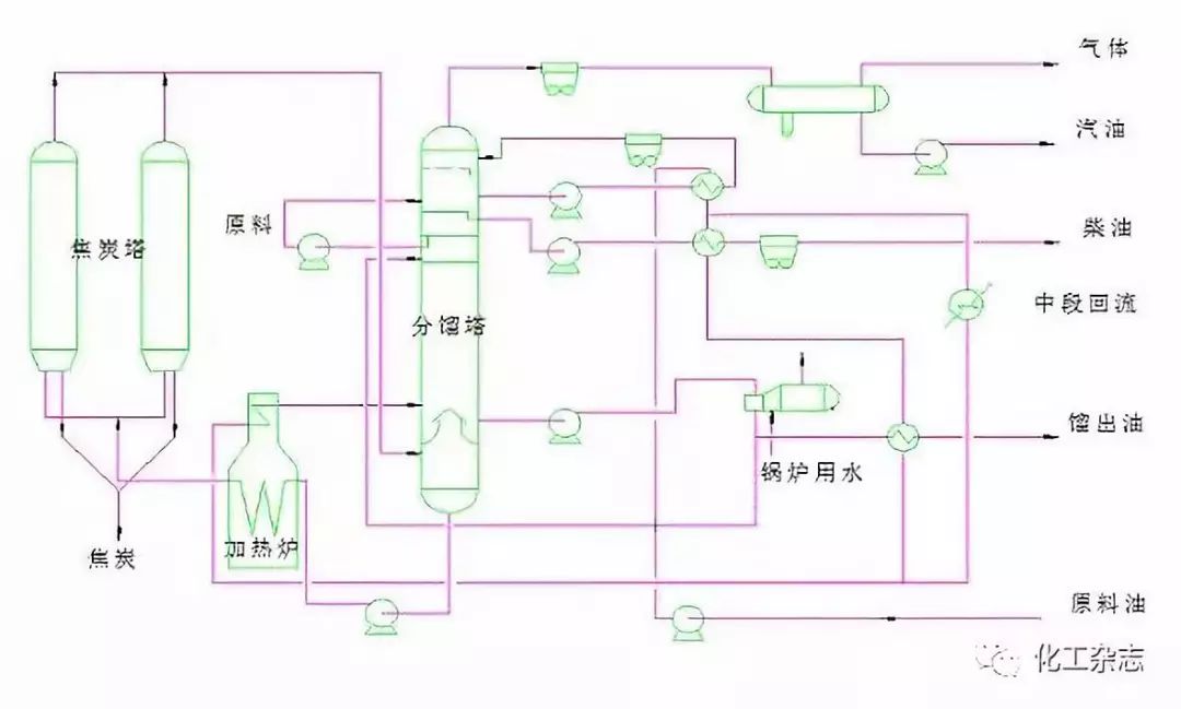 原料在焦炭塔内反应生成焦炭聚积在焦炭塔内,油气从焦炭塔顶出来进入分馏塔,与原料油换热后,经过分馏得到气体、汽油、柴油和蜡油。塔底循环油和原料一起再进行焦化反应。