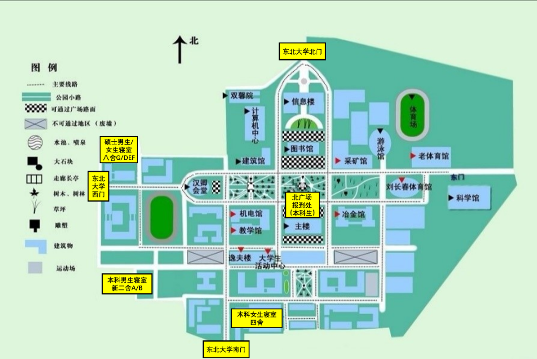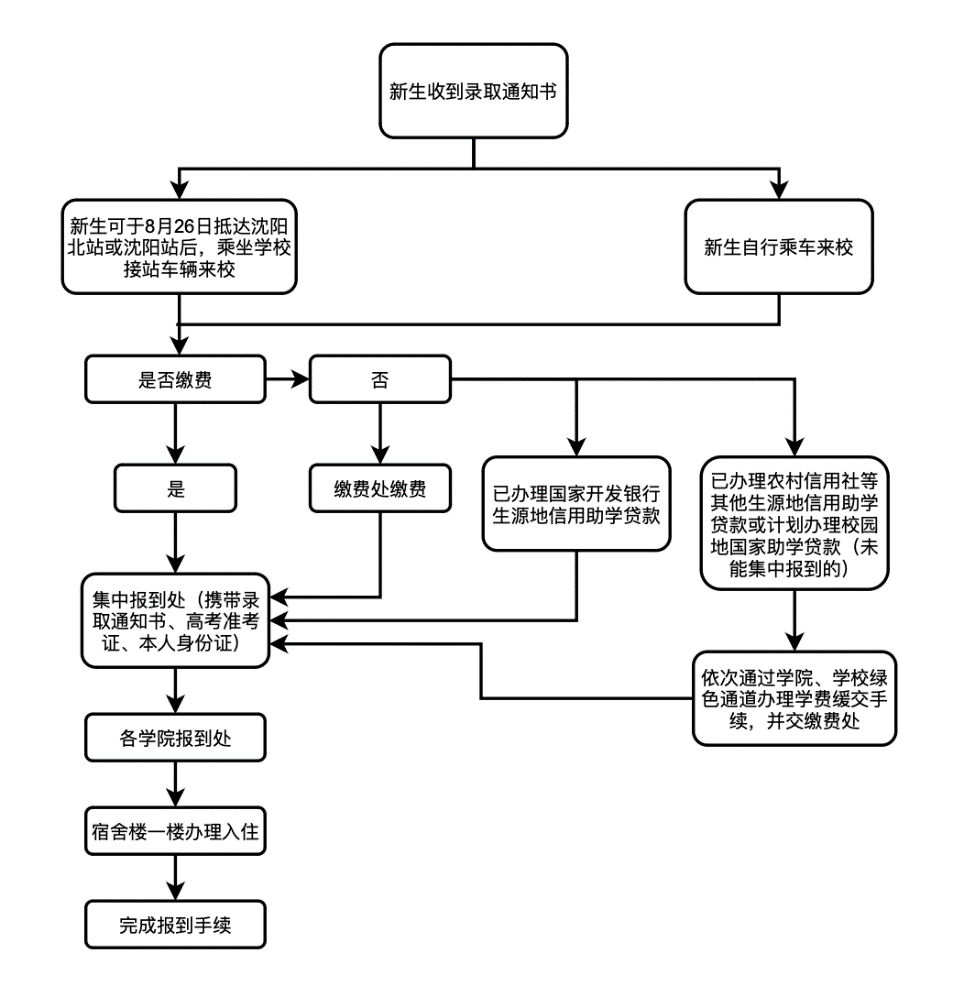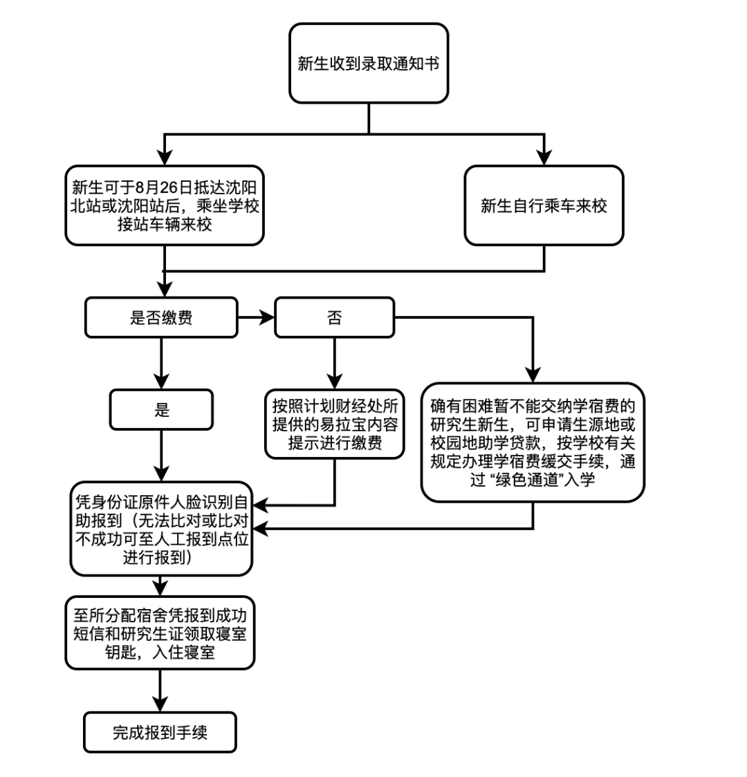 学校于8月26日8:00-20:00在沈阳北站南出口和沈阳站东出口分别设立接待站,新生在此期间到站后可与接待站联系,凭录取通知书由佩戴东北大学迎新工作人员标牌的工作人员统一安排乘坐学校的免费接站车来校。学校在接待站没有安排任何代办入学手续或代购物品事宜,谨防上当受骗。