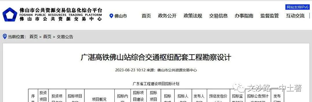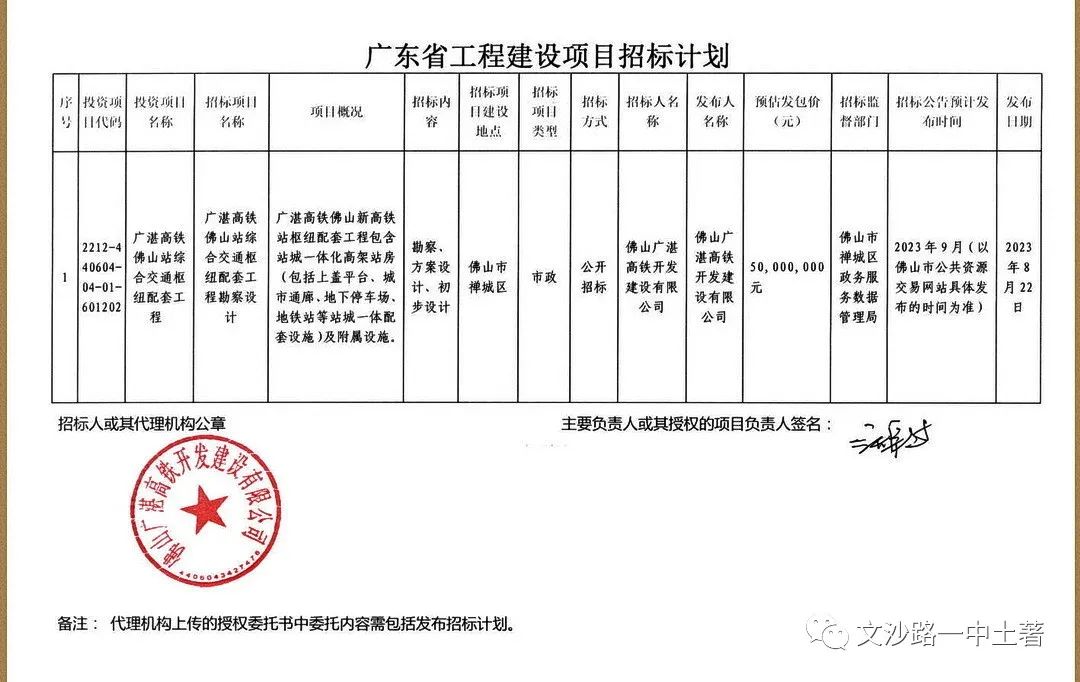 佛山市公共资源交易中心发布了招标计划,“广湛高铁佛山站综合交通枢纽配套工程勘察设计”项目拟于9月进行招标。