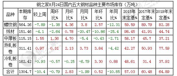 据钢之家网站对国内33个市场及港口调查统计,本周国内螺纹钢、线材、中厚板、热轧板卷、冷轧板卷五大品种库存量为1304.7万吨,较8月17日调查减少10.4万吨,下降0.79%。其中: