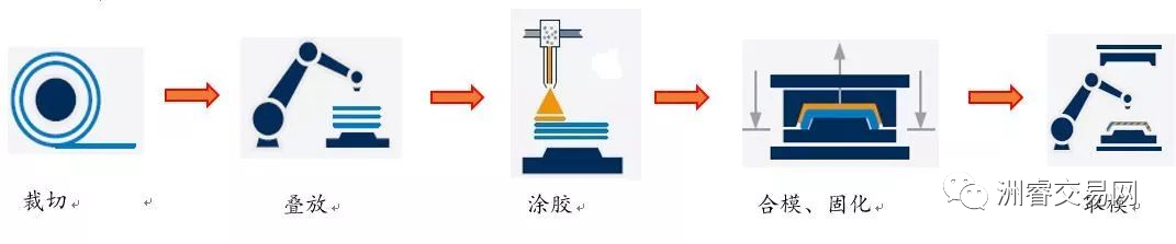 本期推送介绍的第二个成型工艺是湿法模压工艺,也称WCM(是Wet Compression Molding的简称)工艺,先来看相关的工艺流程图:
