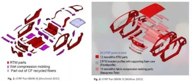 上图是湿法模压工艺在BMW i3和i8车型中应用图示,其中在BMW i3(右)中使用了17个“湿压部件”,在i8(左)中使用了21个。