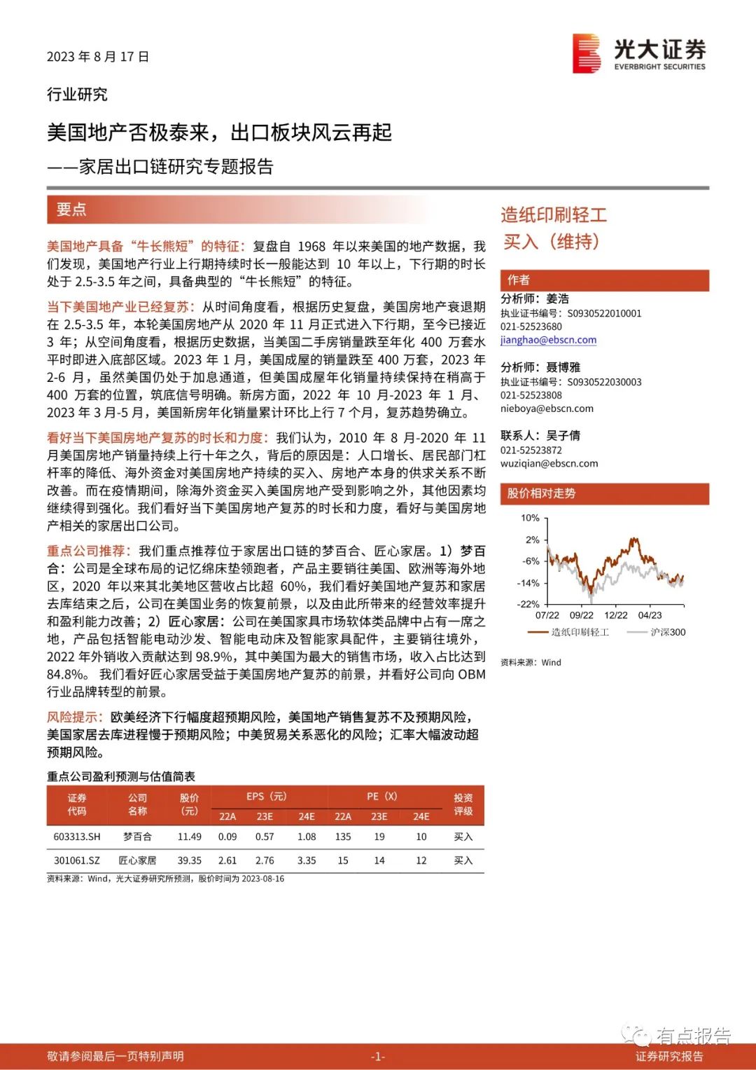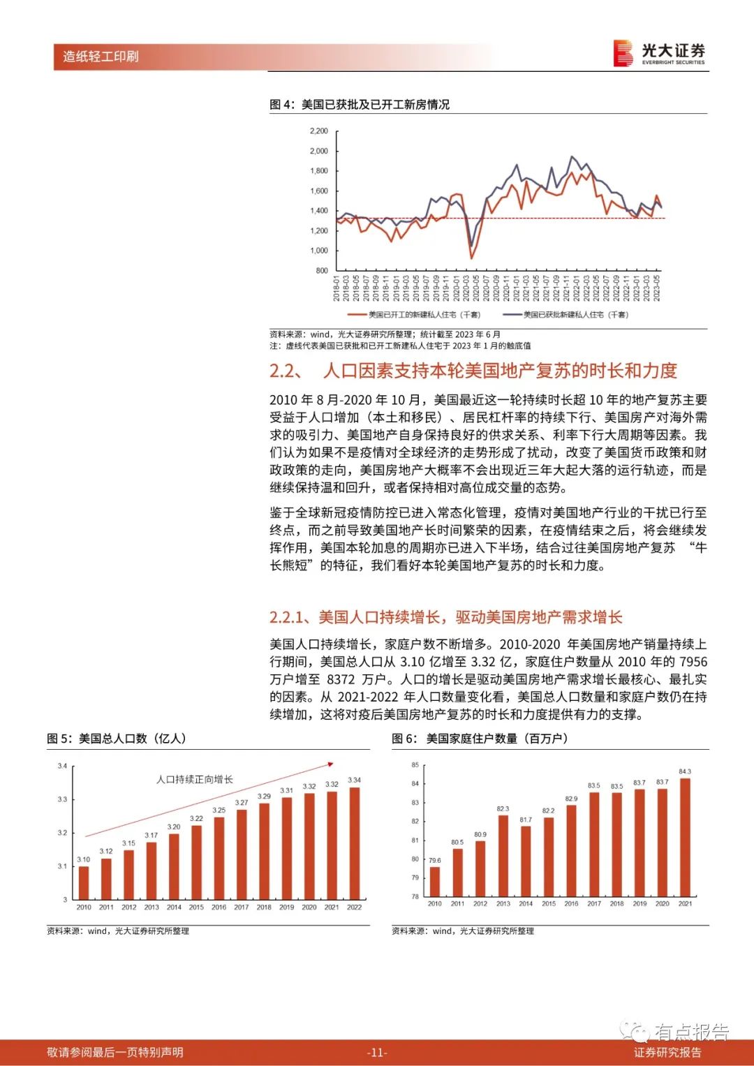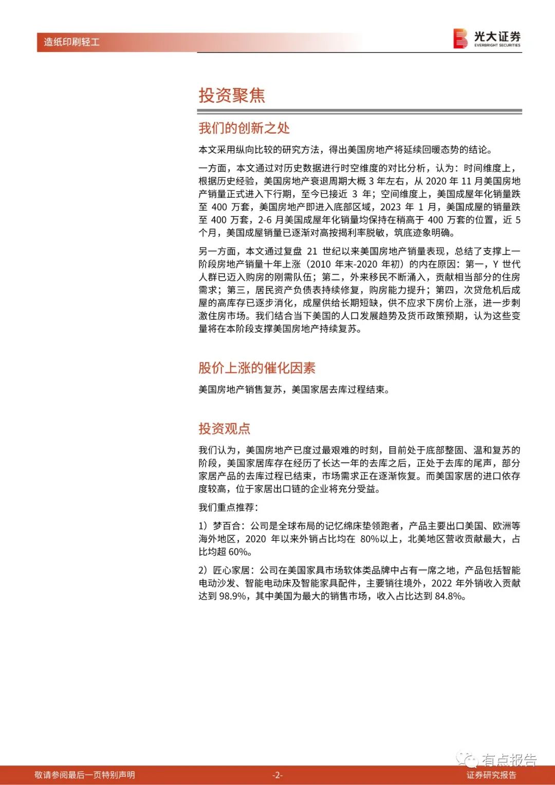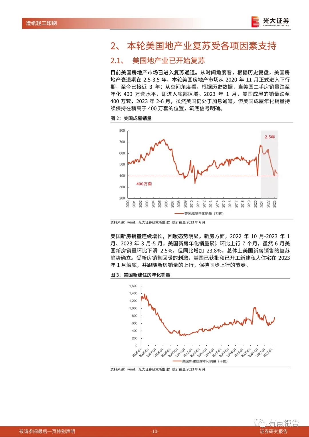 当下美国地产业已经复苏:从时间角度看,根据历史复盘,美国房地产衰退期在2.5-3.5年,本轮美国房地产从2020年11月正式进入下行期,至今已接近3年;从空间角度看,根据历史数据,当美国二手房销量跌至年化400万套水平时即进入底部区域。